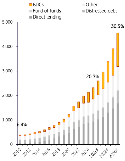 실제로 사모 대출 시장 내에서 2010년 기준 약 6%에 불과했던 BDC의 비중은, 2030년에는 무려 31% 수준, 즉 시장 내 3분의 1에 달하는 비중까지 확대될 것으로 전망되고 있습니다.