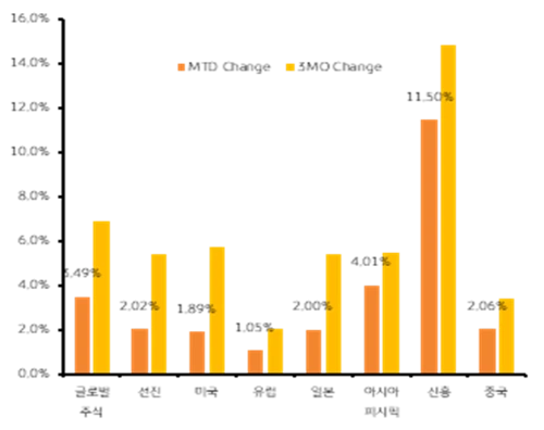 최근 시장의 시선이 가격 변동성이 컸던 원자재와 에너지 섹터에 쏠려 있었지만, 사실 글로벌 주식 시장 또한 약 2% 수준의 안정적인 수익률을 기록하며 견조한 흐름을 이어왔습니다.