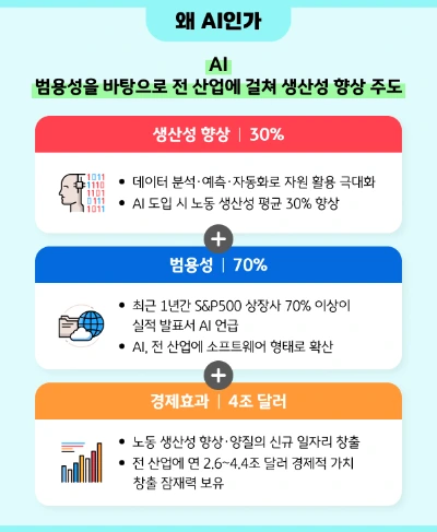 AI는 자동화와 데이터 기반 의사결정을 통해 전 산업의 생산성을 구조적으로 끌어올리고 있습니다.