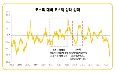 과거 사례를 보면 2013년 창조경제나 2018년 자본시장 혁신 성장 등 정부의 강력한 활성화 정책이 나올 때마다 코스닥은 코스피를 뛰어넘는 성과를 기록했습니다.
