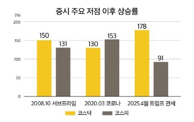 두 시기 모두 저점 이후 반등폭은 약 130~150% 수준이었고, 코스피와 코스닥의 상승폭도 대체로 비슷한 흐름을 보였습니다.