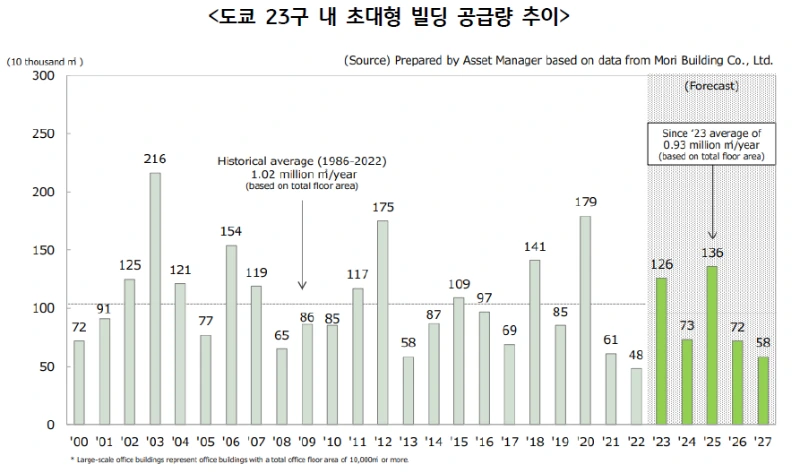 상황이 이렇다 보니, 일각에서는 과잉공급을 우려하는 목소리도 나오고 있습니다. 실제로 도쿄 23구 내에서 앞으로 공급되는 초대형 오피스 빌딩(바닥 면적 10,000제곱미터 이상) 수치를 살펴보면, 올 해와 2025년의 공급량이 과거 약 40년 평균치를 크게 웃도는 것으로 조사되었기 때문입니다.