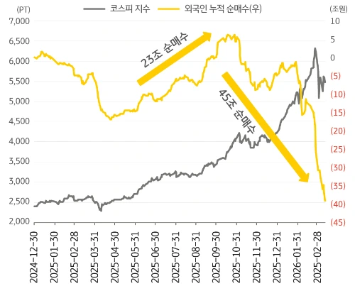 또한 최근에는 코스피 시장에서 외국인이 연일 조 단위 매도를 이어가고 있어 투자자들의 불안감이 커지는 모습입니다.