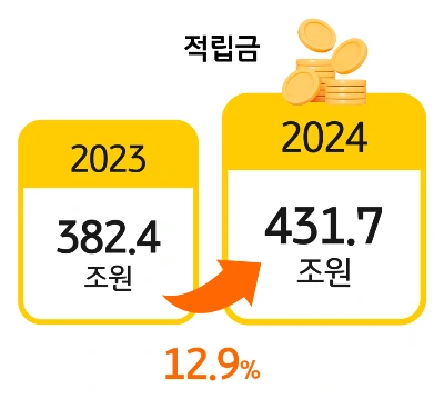 2024년 말 기준 퇴직연금 적립금은 431.7조원까지 늘었고, 처음으로 400조원을 넘어섰습니다.