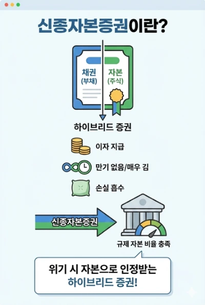 신종자본증권은 이자를 지급하면서도 만기가 없거나 매우 길고, 위기 시 손실 흡수 기능을 통해 자본으로 인정되는 증권이라고 할 수 있습니다.
