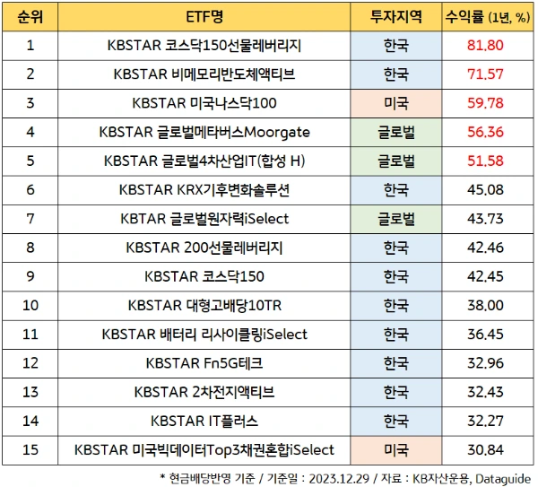 2023년 1년간 가장 높은 수익률을 낸 KBSTAR ETF TOP 15개는 위와 같습니다.
