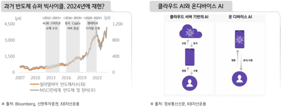 2023년 생성형 AI의 대장주로 엔비디아가 주목을 받았다면, 2024년에는 온디바이스 AI가 떠오르며 관련 투자 테마가 아래와 같이 세분화될 것으로 보입니다.