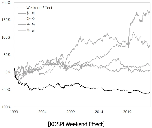 위의 그림을 통해 지난 2000년부터 2024년까지 주말 동안 KOSPI를 보유했다면(금요일에 사서 월요일에 매도한 경우) 지난 24년간 마이너스 수익률을 기록했다는 것을 알 수 있습니다.