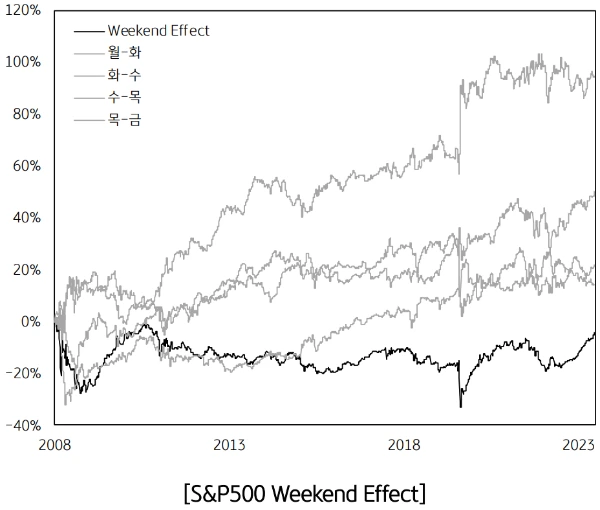 표를 통해 확인해 보아도 모든 기간 중 금-월의 시간, 즉 월요병(Weekend Effect) 기간이 특별히 수익률이 안 좋은 것을 확인할 수 있습니다.