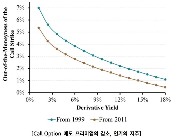 특히 최근에 가까워질수록 커버드콜 전략의 인기에 힘입어 콜옵션 매도의 프리미엄이 줄어드는 현상이 발생하며 이는 더욱더 심화되고 있습니다. 콜옵션 매도를 하는 사람이 많아지며 공급량이 증가하자 프리미엄이 하락하게 된 것입니다.