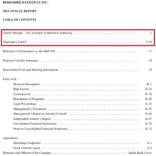 이번 연간 보고서에는 찰리 멍거를 위한 추도사가 가장 앞에 위치해 있습니다. 그 뒤를 워렌 버핏의 주주 서한과 S&P500과의 성과 비교, 그리고 본격적인 영업보고서에 해당하는 Form 10-K가 이어갑니다.
