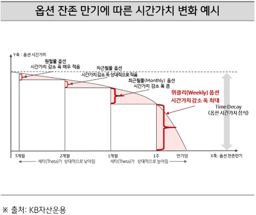 옵션의 시간가치는 잔존만기가 짧아질수록 급격히 감소해 옵션 매도자에게 유리하게 작용합니다. 만기가 가장 짧은 위클리(Weekly) 콜옵션을 매도해 기존 커버드콜 전략 대비 높은 인컴을 추구하는 것입니다.