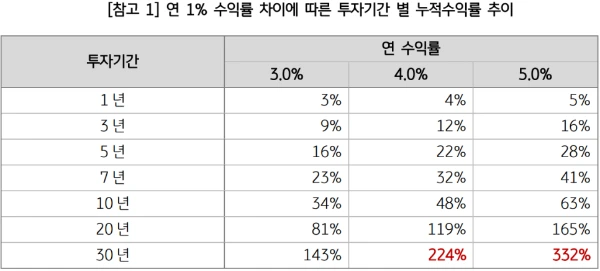 장기투자에 있어 작은 수익률 차이가 큰 결과로 이어진다는 것, 꼭 기억하셨으면 좋겠습니다.