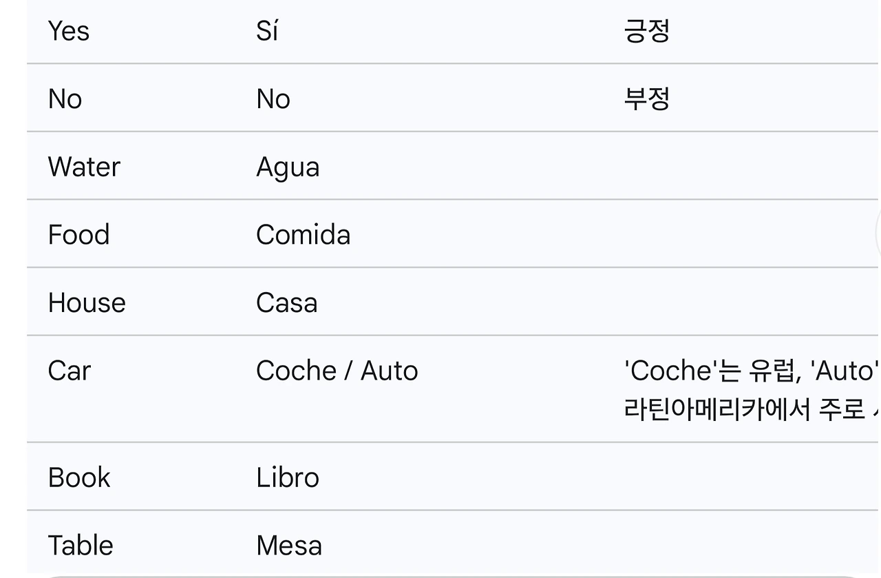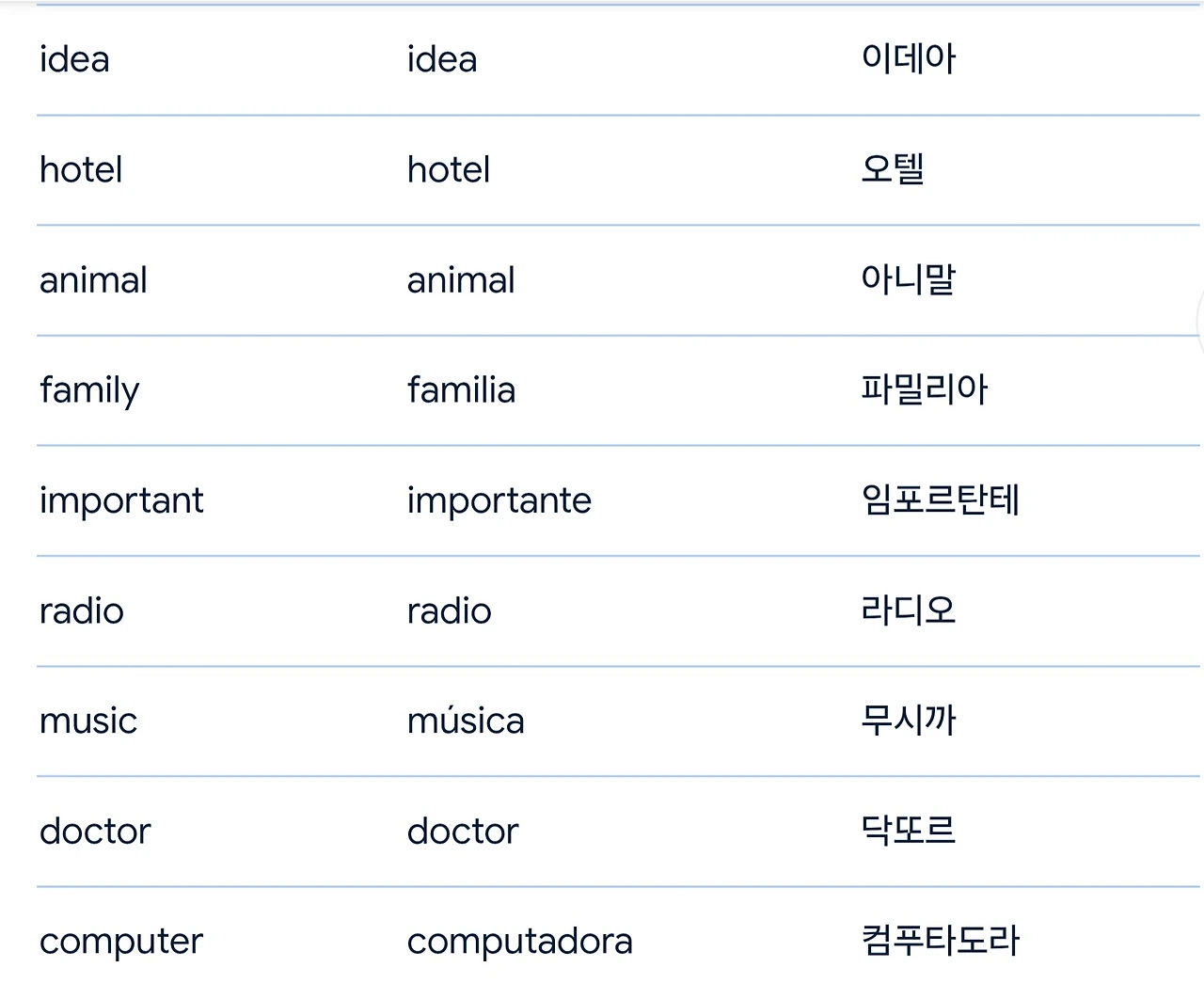 아래의 스페인어 단어들은 영어와 95% 이상 같아서 발음만 조심하면 그대로 활용할 수 있겠다. 이와 같이 유사한 단어들은 무수히 많다.
