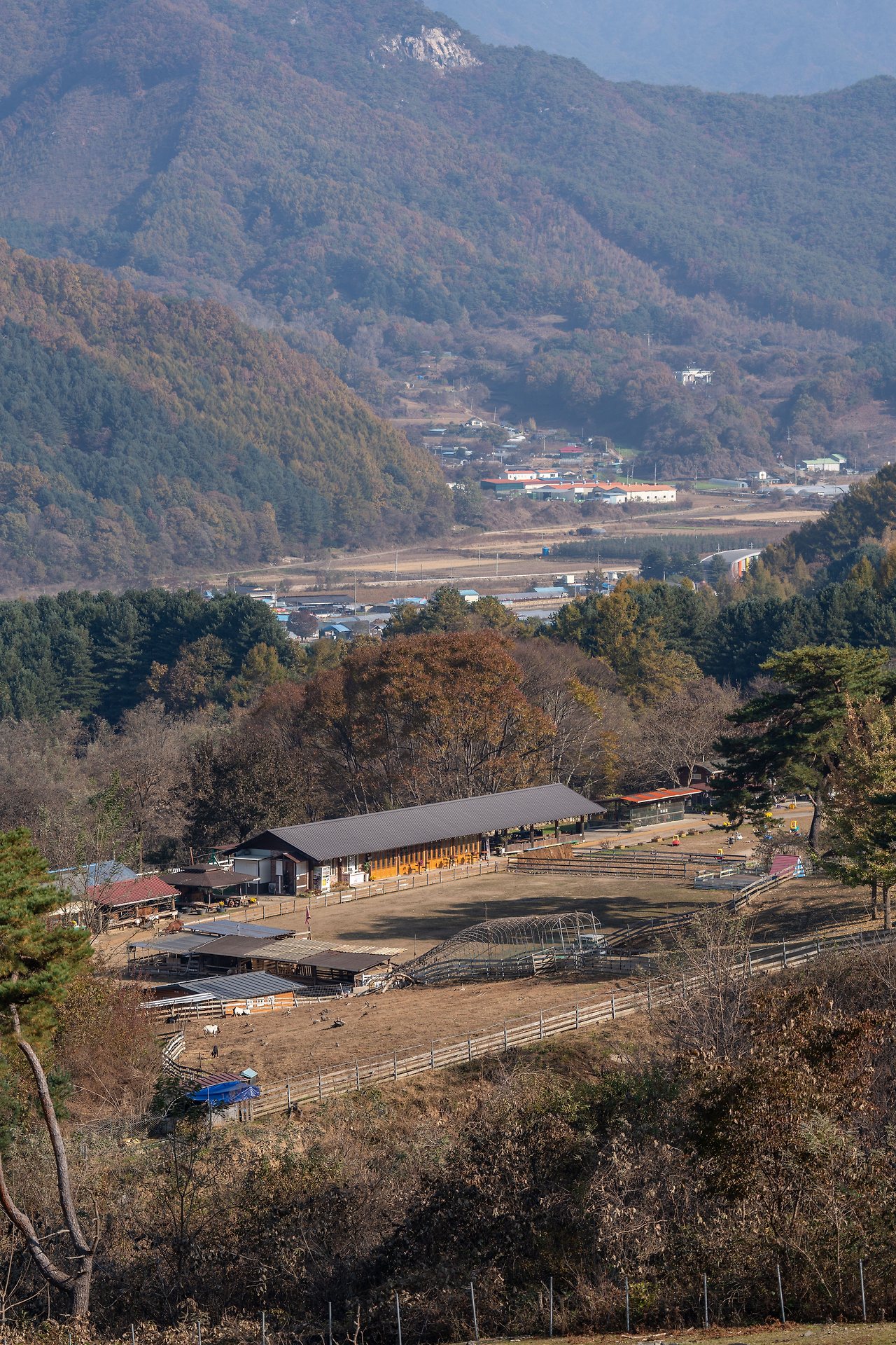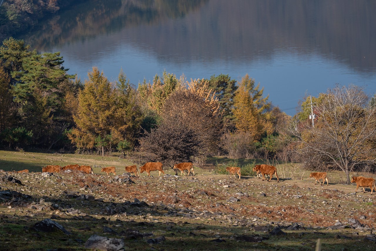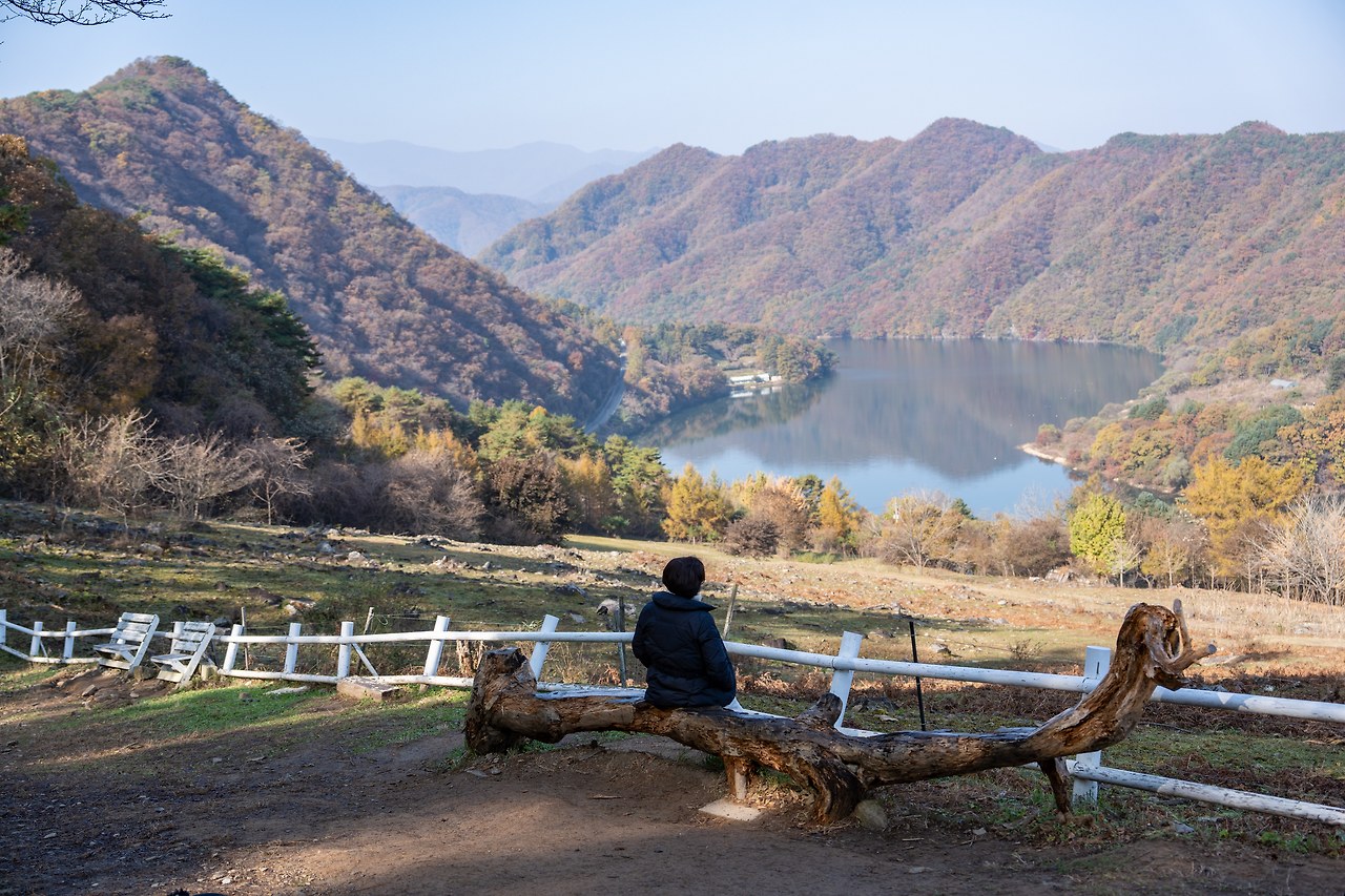 목장 입구에 도착하자마자 드넓은 초원이 눈앞에 펼쳐졌습니다. 파란 하늘과 맞닿은 언덕은 가을빛으로 곱게 물들어 있었고, 멀리 춘천호의 잔잔한 물결이 반짝였습니다.