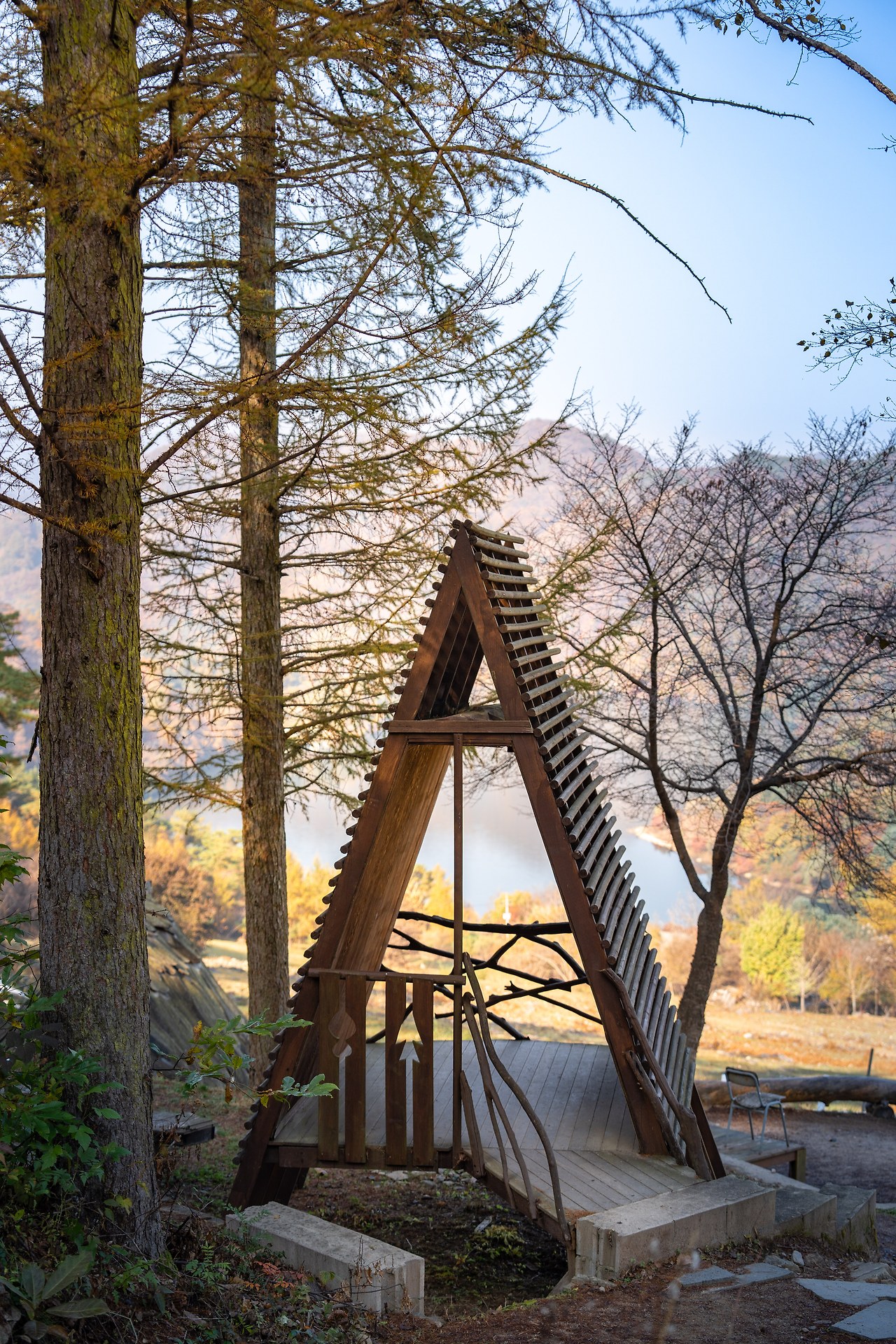 해피초원목장의 하이라이트는 단연 방목장 전망대였습니다. 완만한 오르막길을 10여 분 걸어 올라가자, 탁 트인 시야와 함께 아름다운 포토존이 나타났습니다. 춘천호를 배경으로 그림 같은 단풍이 펼쳐져 있었고, 그 앞에서 사람들은 저마다 가을날의 추억을 사진 속에 담고 있었습니다.