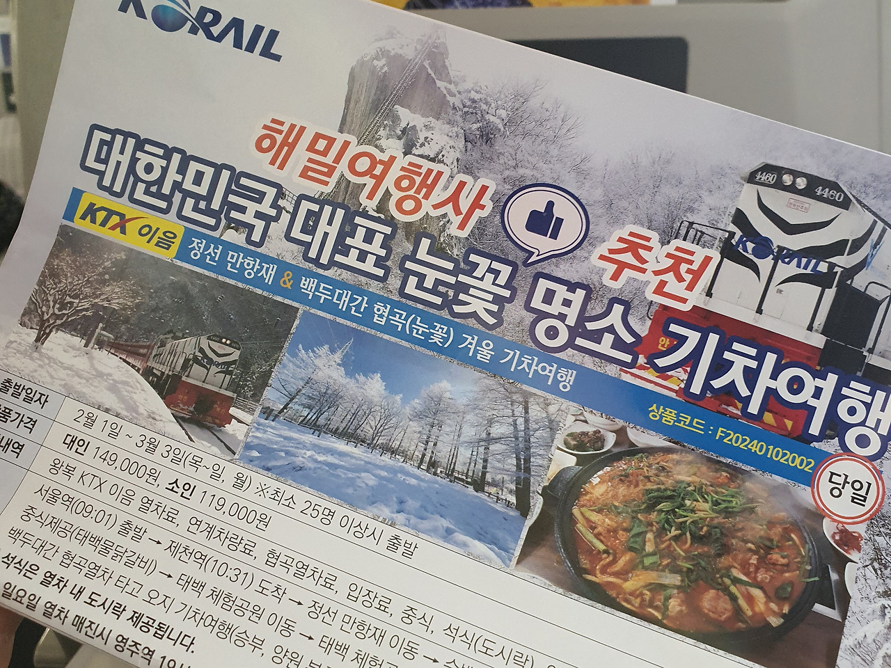 12월의 어느 날, 새로고침의 목적으로 눌렀다 바로 닫을 요량으로 열었던 광고문자가 제 시선을 잡았습니다. 눈을 보러 떠나는 기차여행. 약간 부담이 될 수도 있는 가격이었지만, 왠지 이건 꼭 가봐야 할 것 같은 끌림이 있었습니다. 그래도 혼자 갈 수 없는 여행이기에 잠시 주저하다, 몇 시간 뒤에도 뇌리에 남아 신호를 보내는 그 여행을 3인분으로 결제해 버렸습니다.