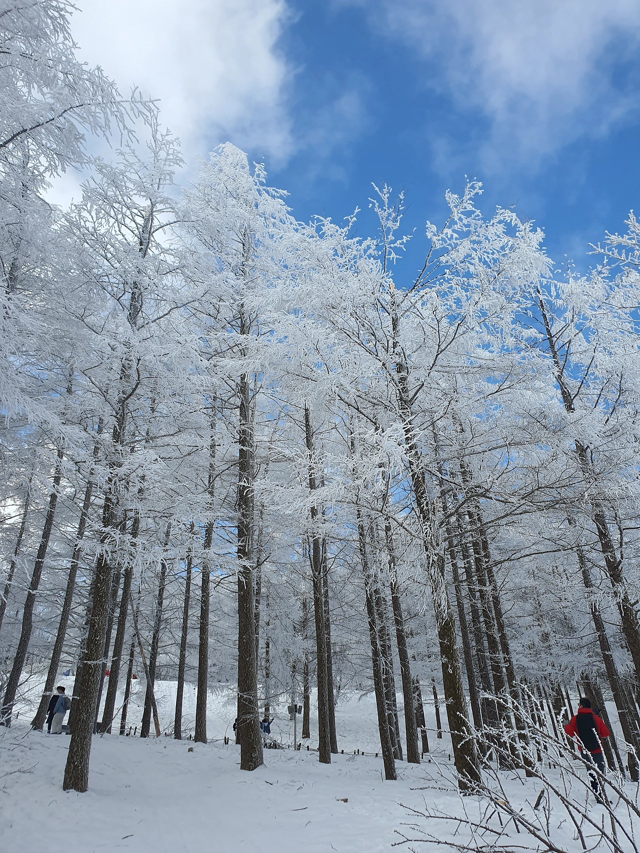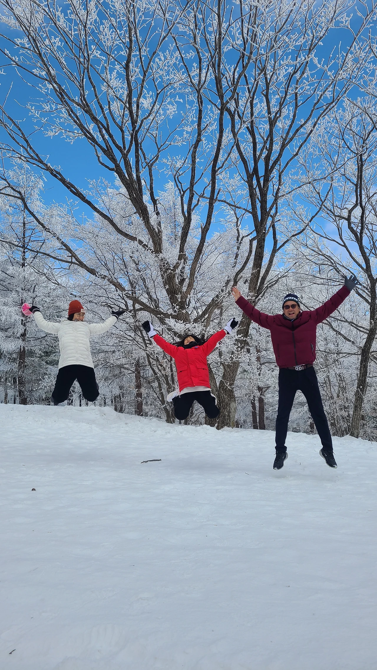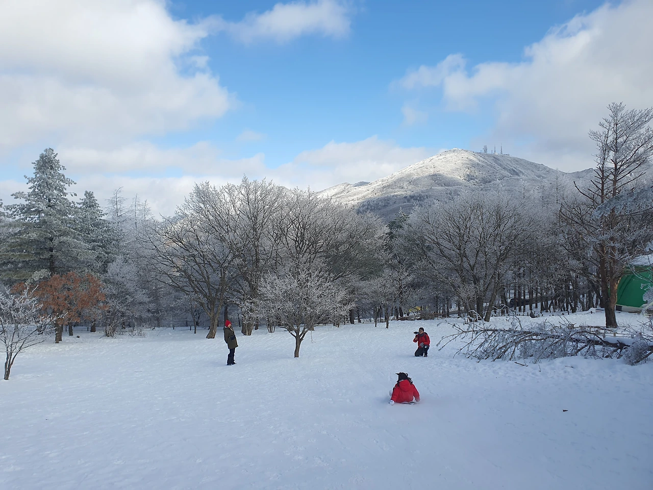 저는 사진을 찍고, 아이는 어디선가 구해서 먼저 온 분들이 타고 남긴 포대자루를 깔고 썰매를 타고, 남편은 나뭇가지를 흔들어 눈을 맞으며 그렇게 우리는 그곳을 각자의 방식으로 즐겼습니다. 패키지여행이 아니었다면 몇 시간이고 그곳에서 보낼 수 있었을 텐데...라는 아쉬움이 없지 않았지만, 1시간이라는 짧은 시간이었기에 더 밀도 있게 그곳의 경치를 누렸다는 생각도 해봅니다.