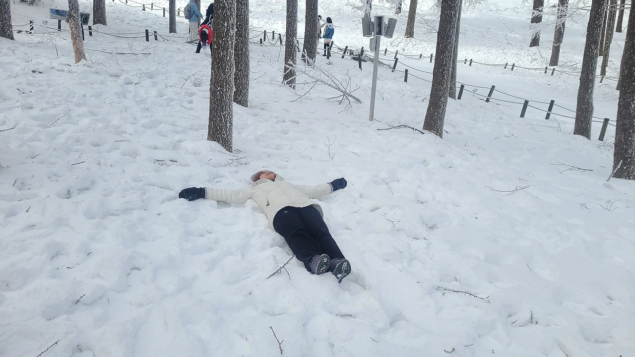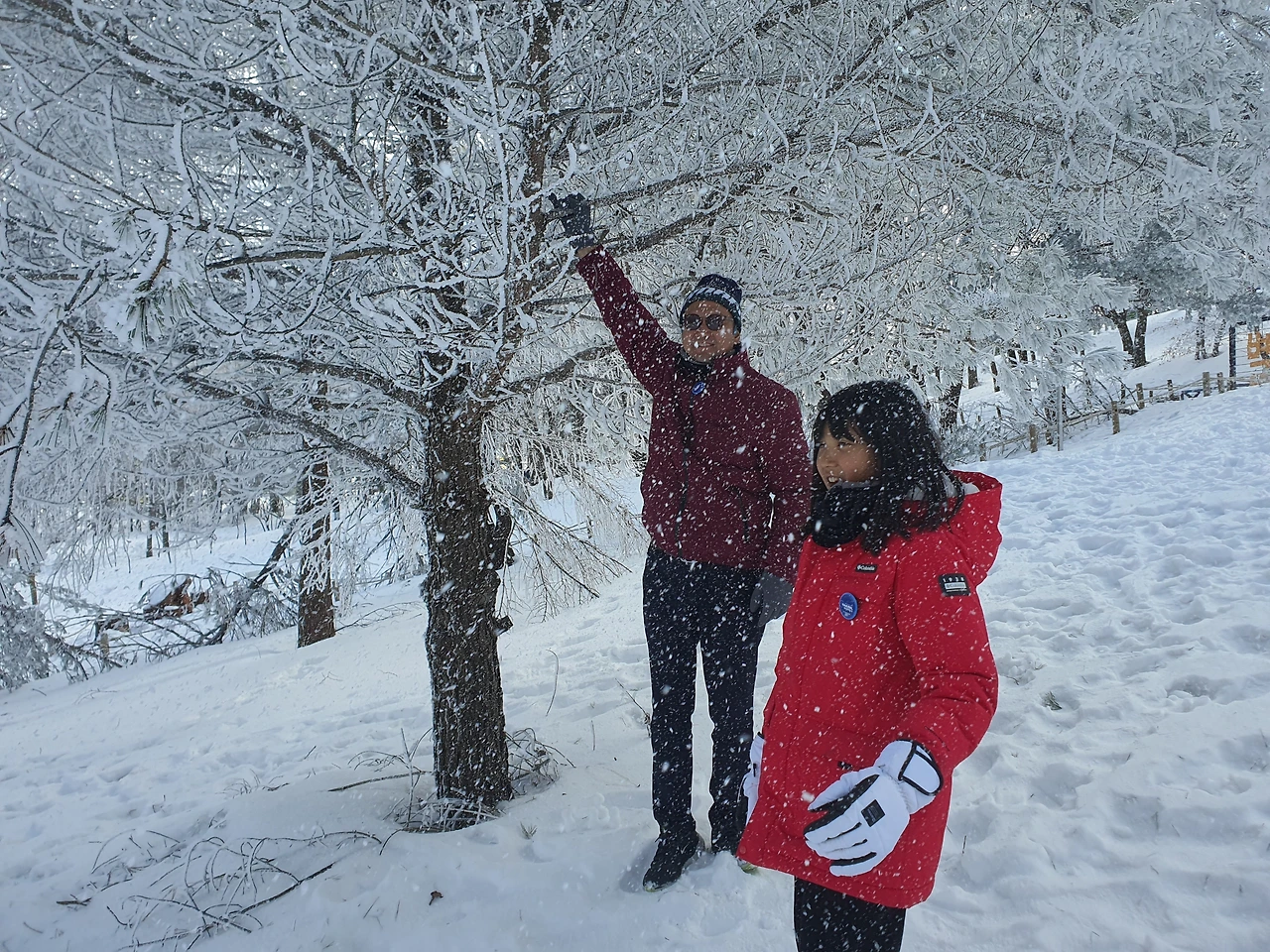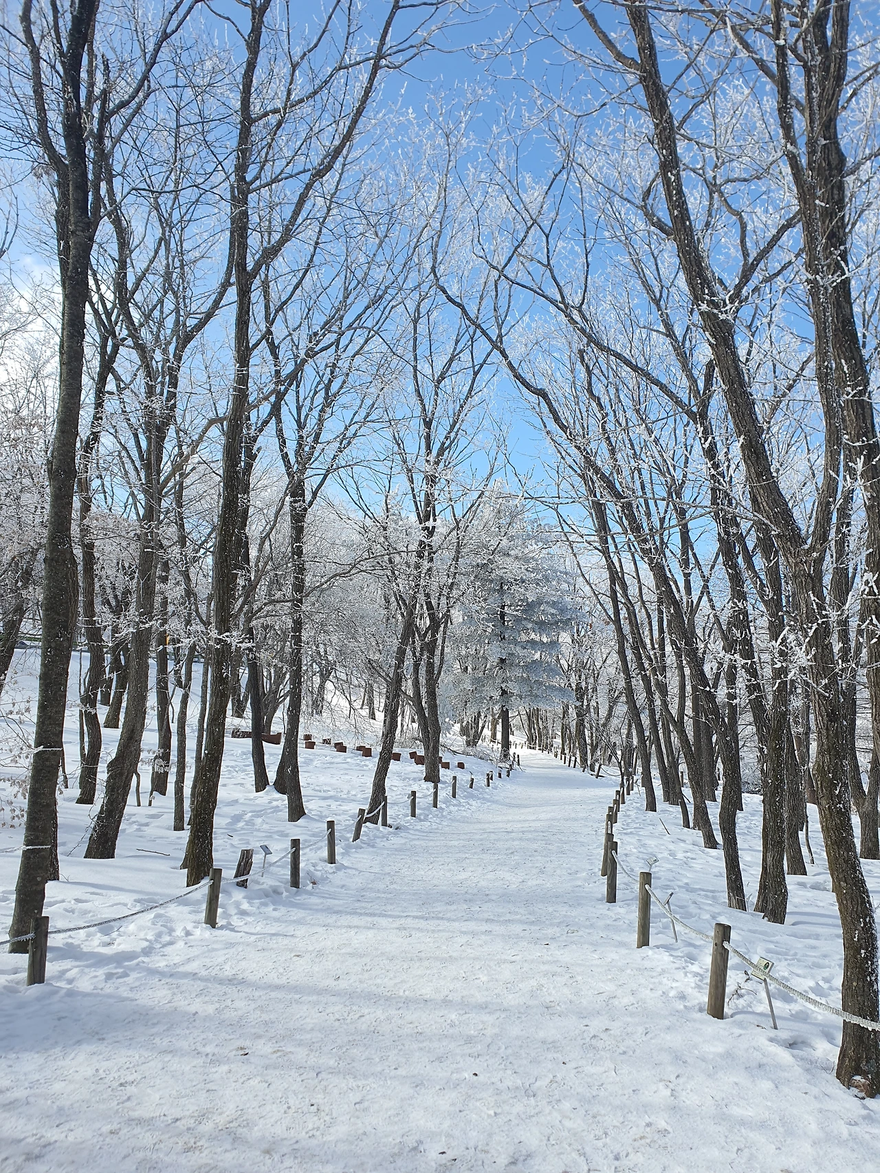 저는 사진을 찍고, 아이는 어디선가 구해서 먼저 온 분들이 타고 남긴 포대자루를 깔고 썰매를 타고, 남편은 나뭇가지를 흔들어 눈을 맞으며 그렇게 우리는 그곳을 각자의 방식으로 즐겼습니다. 패키지여행이 아니었다면 몇 시간이고 그곳에서 보낼 수 있었을 텐데...라는 아쉬움이 없지 않았지만, 1시간이라는 짧은 시간이었기에 더 밀도 있게 그곳의 경치를 누렸다는 생각도 해봅니다.