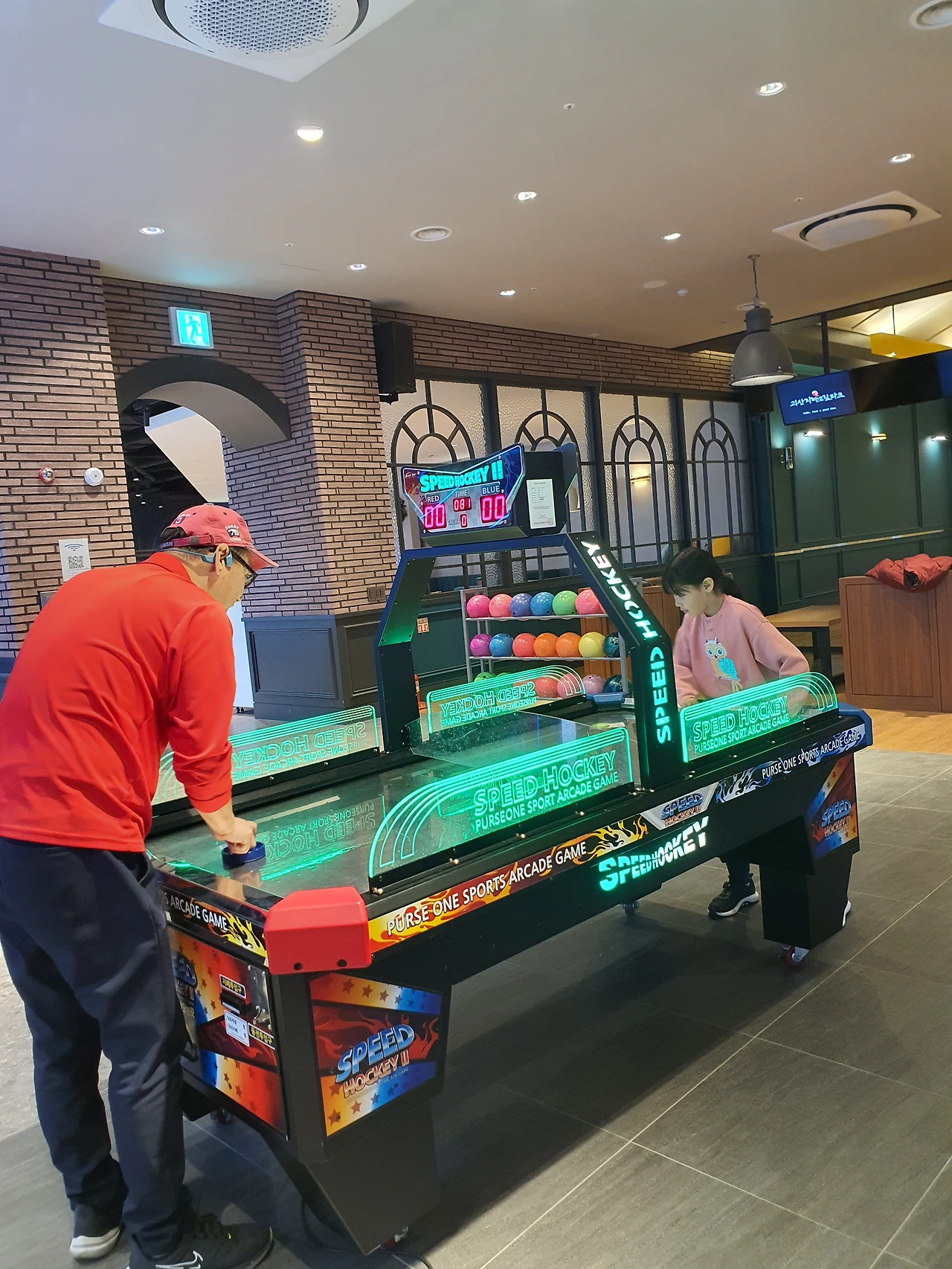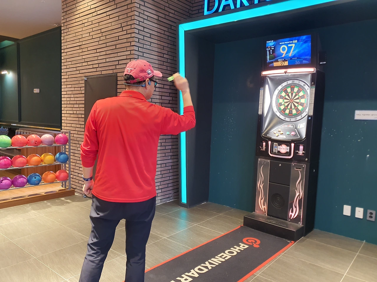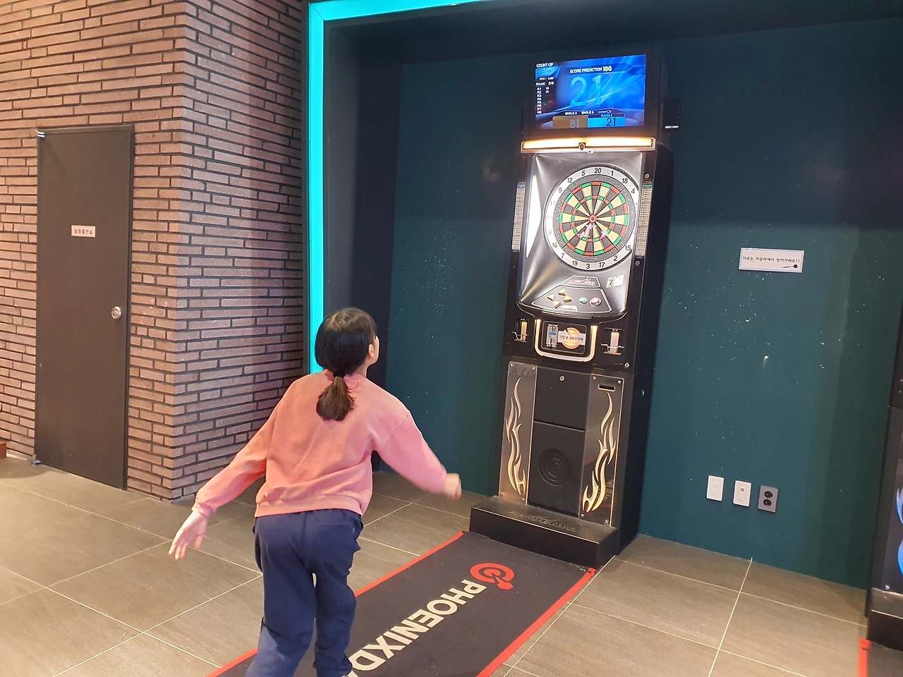 스크린골프와 같은 층에 있는 볼링장에서 아이는 생애 처음으로 볼링을 경험했다. 물론 집에서 닌텐도 Wii sports로는 이미 여러 번 해봤고, 엄마 아빠보다 월등한 실력을 자랑했지만 실제와 게임이 얼마나 다른지 뼈저리게 느꼈을 것이다. 그래도 두 번째 게임에서는 스트라이크도 한 번 하고, 스페어 처리도 몇 번 하는 걸 보니 빠르게 적응해서 게임을 즐기는 모습이 참 신기했다. 볼링장 옆 오락실에서 아빠는 레이싱을 했고, 셋이서 전자 다트와 에어하키, 농구까지 정말 한 번에 할 수 있는 운동경기는 다 했다. 스포츠데이답게!!