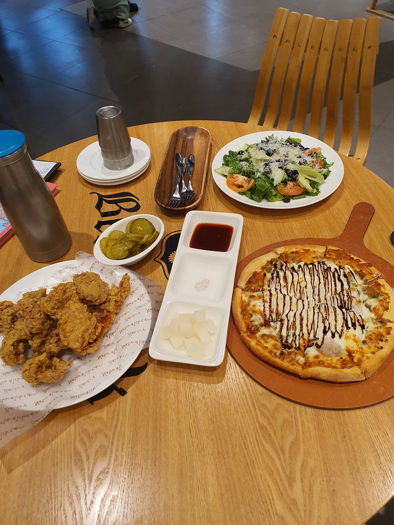 아침을 든든히 먹었음에도 몸을 많이 움직인 덕분에 셋 모두 배가 엄청 고파진 상태로 찜질방 식당으로 갔다. 문이 양쪽에 있어서 찜질방을 이용하지 않은 사람들도 이용이 가능했는데 오랜만에 밖에서 먹는 분식이라 그랬는지, 배가 고파 그랬는지 참 맛있게 먹었다. 평소 아이가 매운 음식을 전혀 못 먹고, 도전도 안 하려고 해서 식당 선정이나 메뉴 선정에 애로가 많았기에, 아이가 떡볶이에 도전을 해서 몇 개 집어먹는 경사까지 있어서 더 좋았던 점심식사였다.