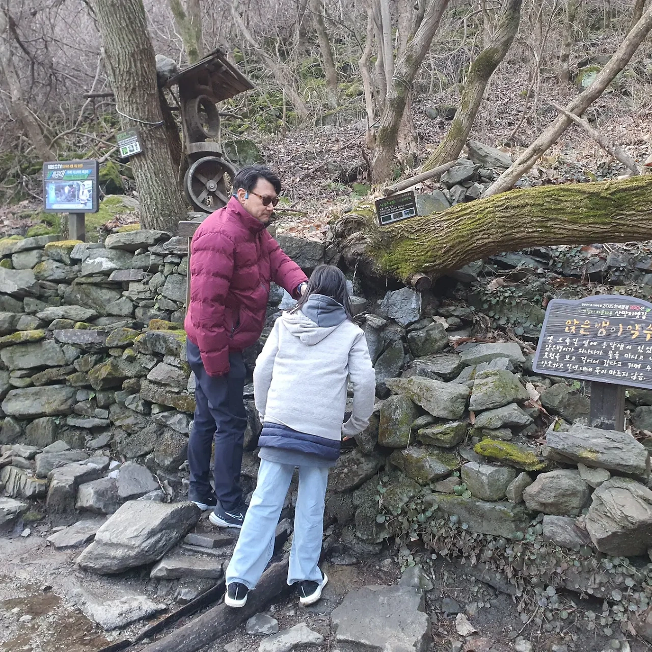 그렇게 출렁다리를 지나서 한참을 걸으니 목이 좀 말랐고, 등산이 아니라는 생각에 물 한병도 안 들고 걷기 시작한 것을 후회할 때쯤 정말 신기하게 약수터가 나타났다. 플라스틱 표주박에 떨어지는 약수를 받아 한 잔씩 들이키고 우린 다시 걸을 힘을 냈다.