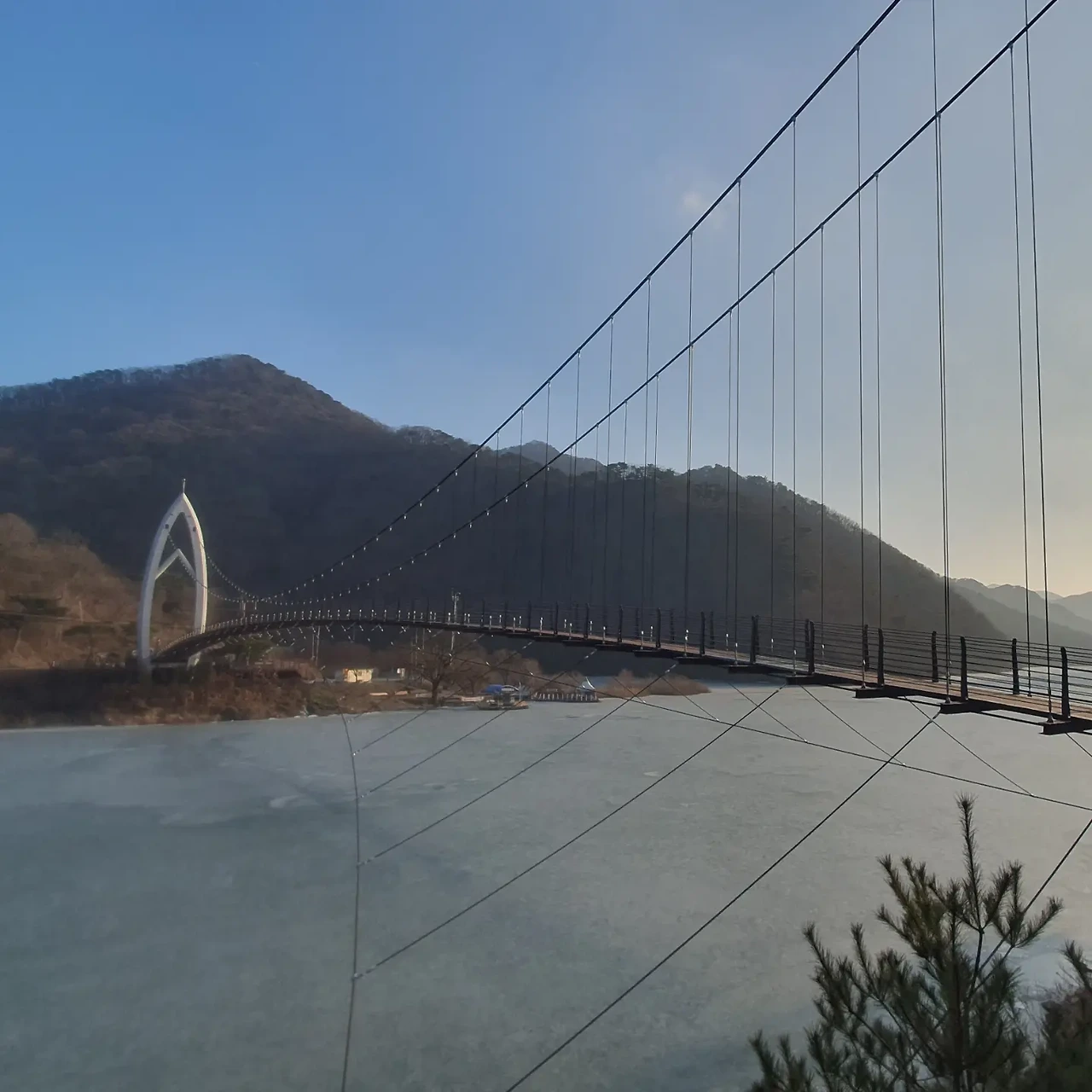 산막이마을을 만났고, 여러 식당들이 있었는데 평일이고 겨울이라 닫혀있는 곳이 많았다. 마을을 지나고 나니 이정표가 보였는데, 구름다리까지 1km가 안된다는 손글씨가 있었다. 그걸 믿고 우리는 더 앞으로 가보기로 했다.