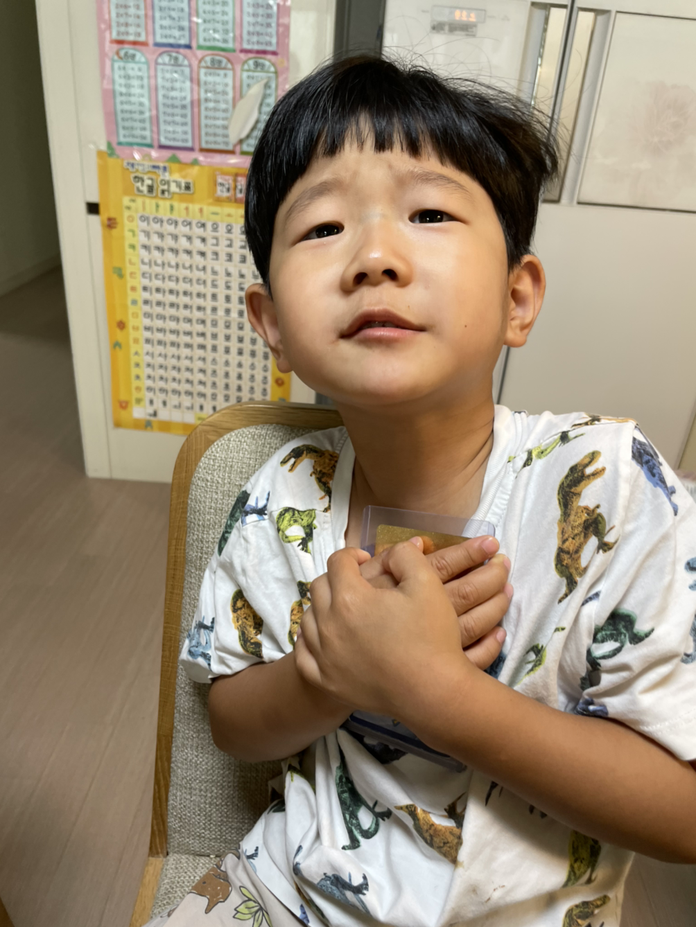 하고 작은 손으로 카드를 꼭 쥐어끌어안는 모습이 어찌나 귀여운지 우리 모두 웃음이 터져나왔습니다.
