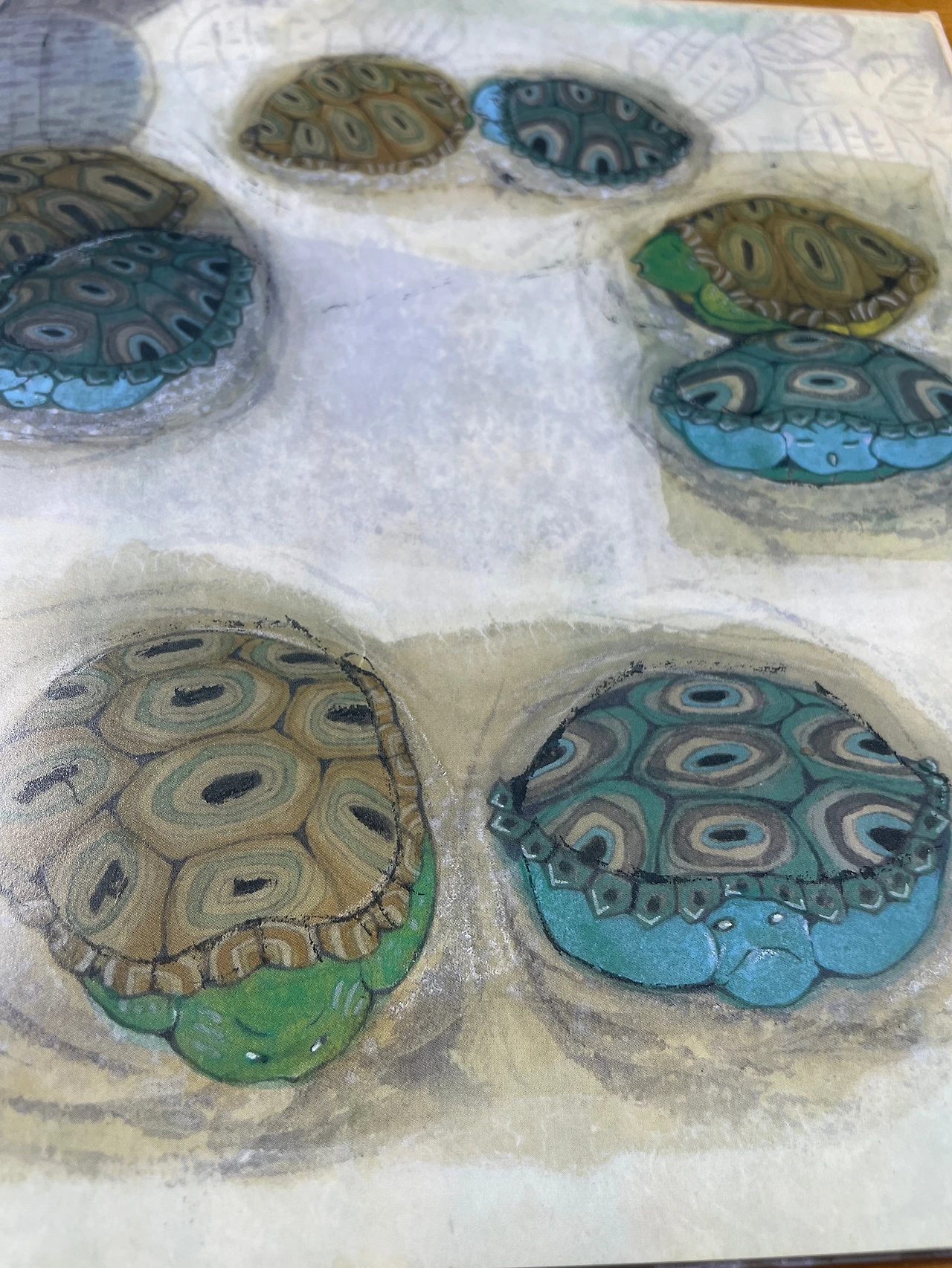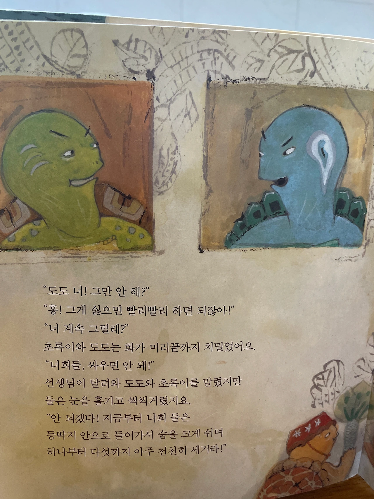 주인공들이 거북이로 묘사되어 있어요. 화가 난 초록이와 도도는 숨을 크게 들이쉬고 내쉬기를 반복하다가 다시 등딱지 밖으로 나와서 화가 난 자신의 감정을 똑바로 마주보고 표현하며 어느새 화가 사그러듭니다.