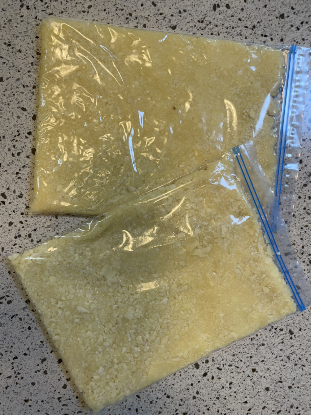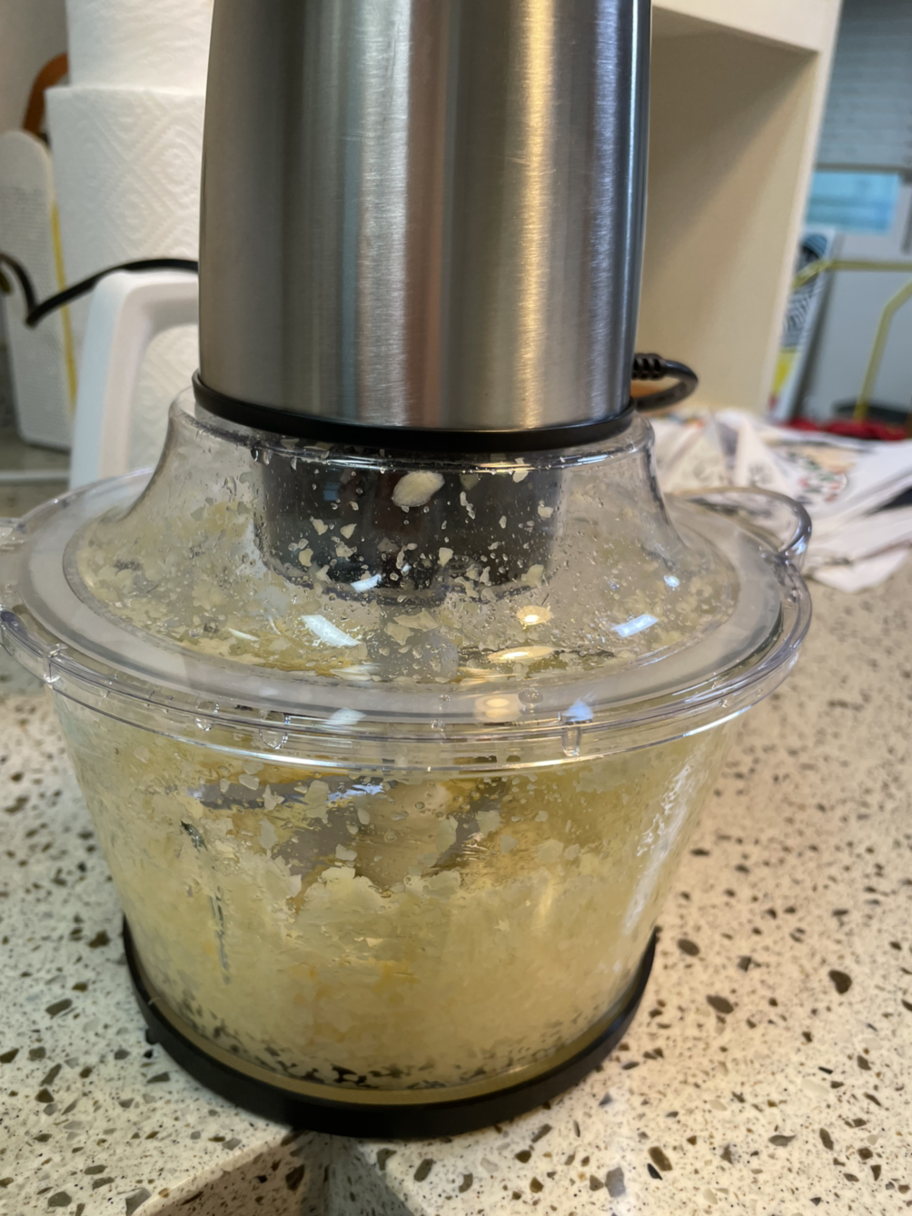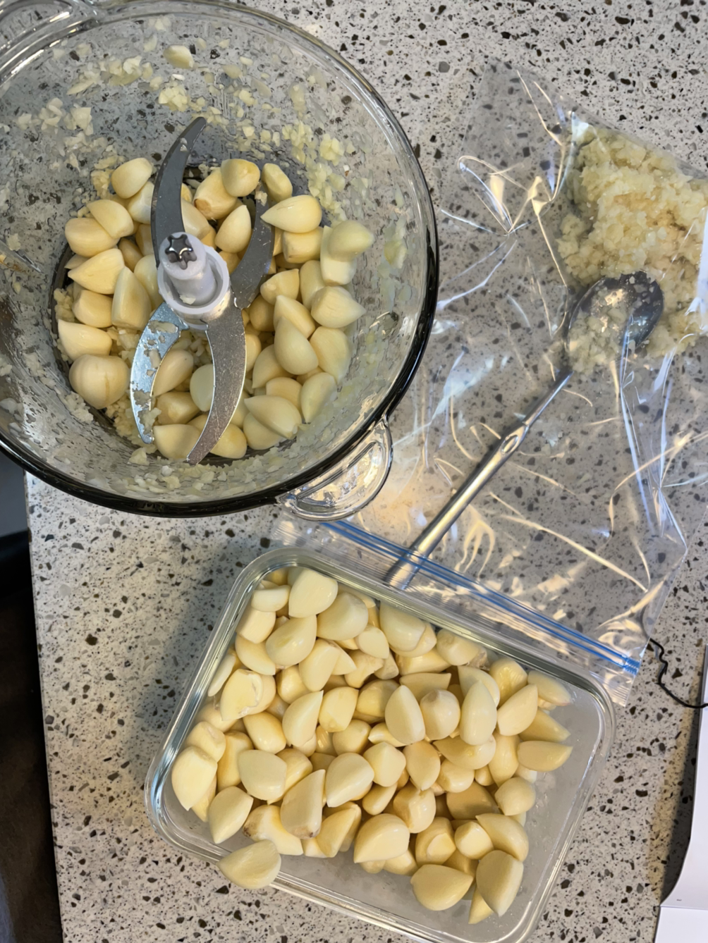 무슨 마늘 하나 깐것 가지고 이렇게 호들갑을 떠느냐고 할 수 있지만, 어린 아이들을 키우며 마늘을 까고 갈고 쟁이는 일이 얼마나 쉽지 않을 일인지 10년동안 무수히 겪어보았기 때문이다. 그렇게 신바람이 나서 4일, 5일동안 틈틈히 마늘을 까기 시작하자 어느덧, 뽀얀 속살을 드러낸 마늘이 수북이 쌓이기 시작한다. 드디어 마늘을 갈아내는 순간 나는 어찌나 기쁘고 감격스럽던지.... 내 손으로 직접 깐 마늘을 갈아놓고 지퍼백에 담아놓자 지퍼백 두개를 가득 채운 갈은 마늘이 생겼다. 절로 속에서 외침이 일어났다.