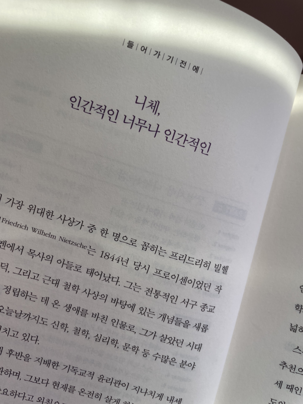 [곁에 두고 읽는 니체]를 읽으며 인간은 누구나 고독의 두려움을 느끼고 그래서 자기도 모르게 나와 같은 또 다른 작은 인간들이 모인 곳으로 발길을 돌리게 된다는 사실을 알게 되었다. 혼자 떨어져 있게 되면 자칫 낙오자가 될 지도 모른다는 불안감에 어떻게든 사람들 속에 섞여 있으려는 것 이라는 사실을 말이다. 나만 그런 것이 아니라는 사실이 위안이 되었다. 그리고 내가 너무나 그러한 이유로 다른 사람들 속에서 섞여 나를 감추고 드러내기를 겁내고 있었다는 사실을 알게 되었다.