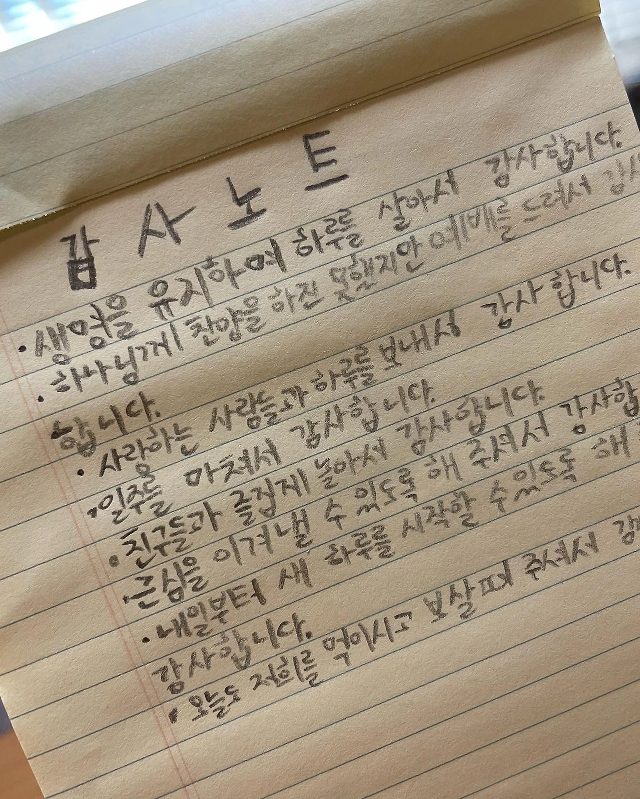 아이를 위해서 기도해주며 불안해하는 아이에게 감사노트를 써보자고 이야기했다. 엄마도 불안해지거나 불평불만이 생기면 감사노트를 쓰는데 그러면 불안과 염려가 사라진다고 말해주었더니 아이는 차분하게 앉아서 감사제목을 하나하나 적어내려간다.