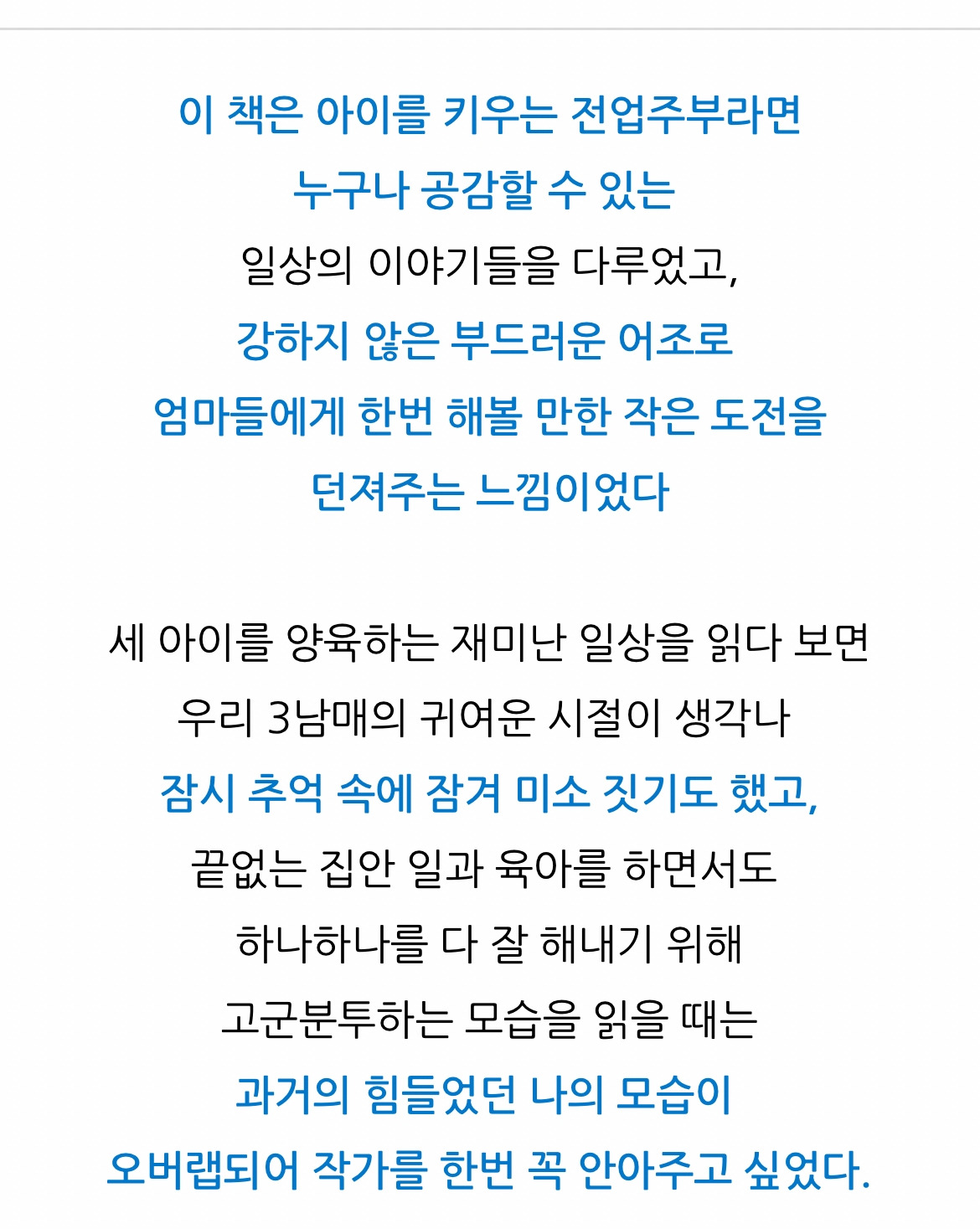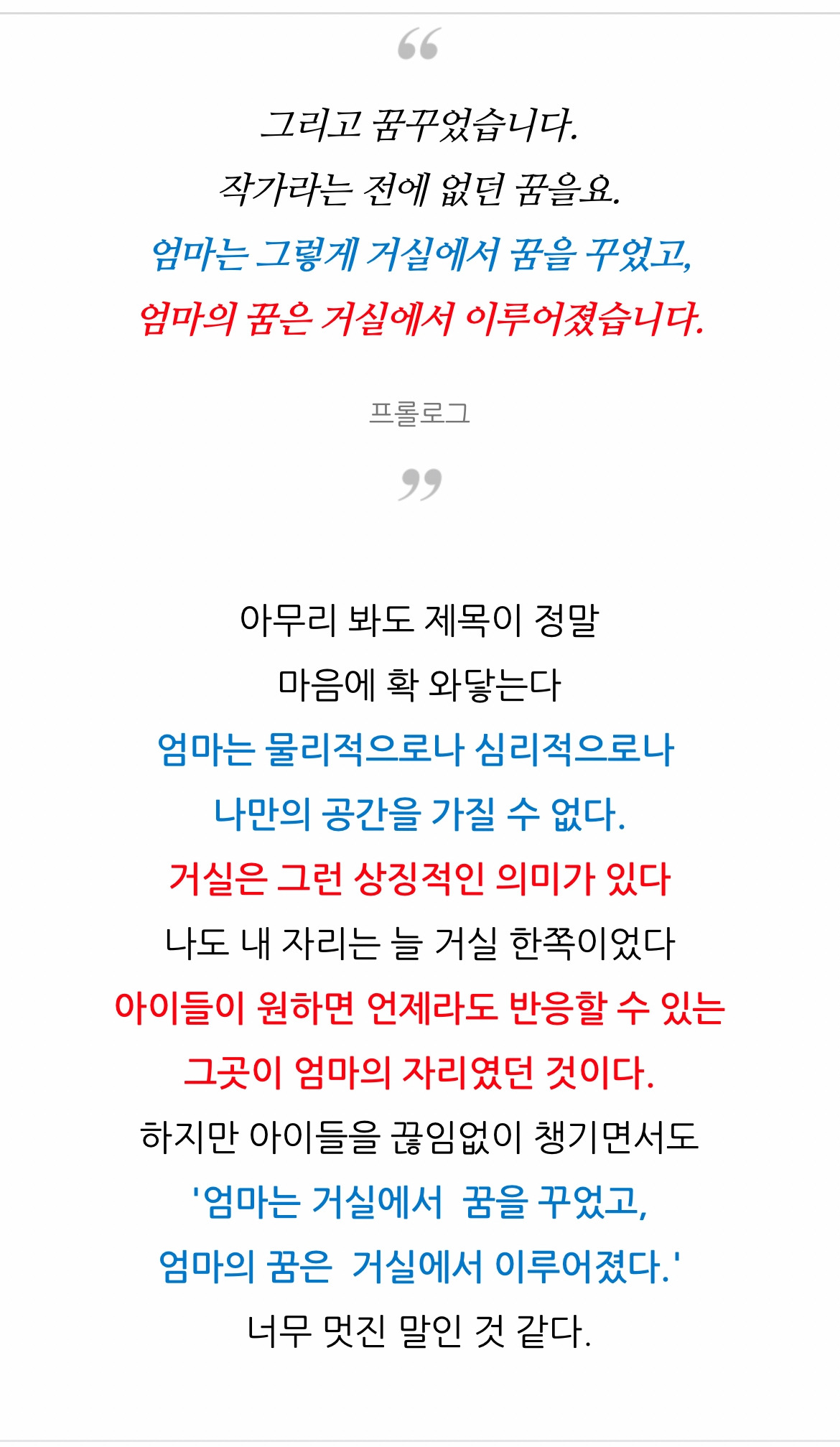 부족한 글이지만 누구나 쓸 수 있는 글이지만 그저 기도했습니다. 먼저 작게는 따뜻하게 다가가 잔잔하게 마음을 울리는 글이 되게 해달라고요. 조금 더 크게는 많은 엄마들이 자신에게 주어진 남편과 자녀, 가정을 잘 돌보고 그런 후에 남는 힘으로, 아니 힘을 만들어 자신의 꿈을 가꾸어나가는 비전을 찾게 되길 바라면서 글을 썼습니다.