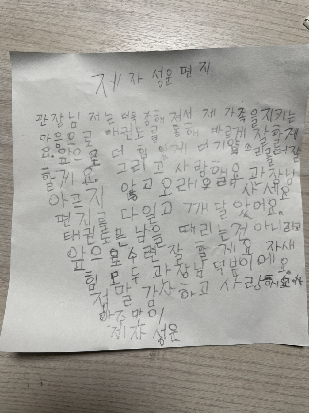 더욱 강해져서 가족을 지키는 마음으로 태권도를 더바르게 잘 배울게요.