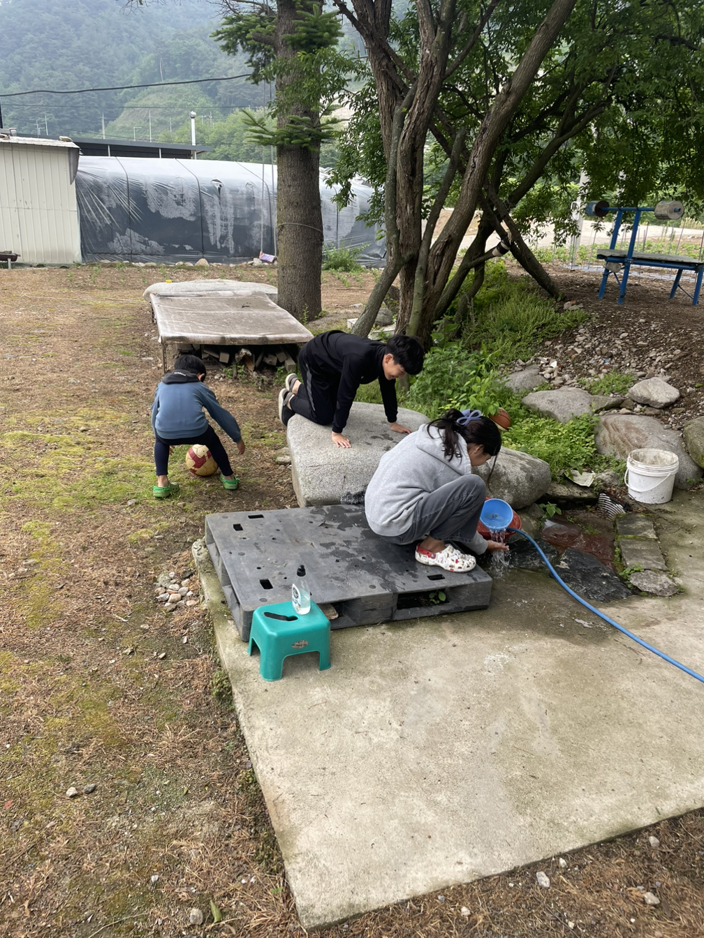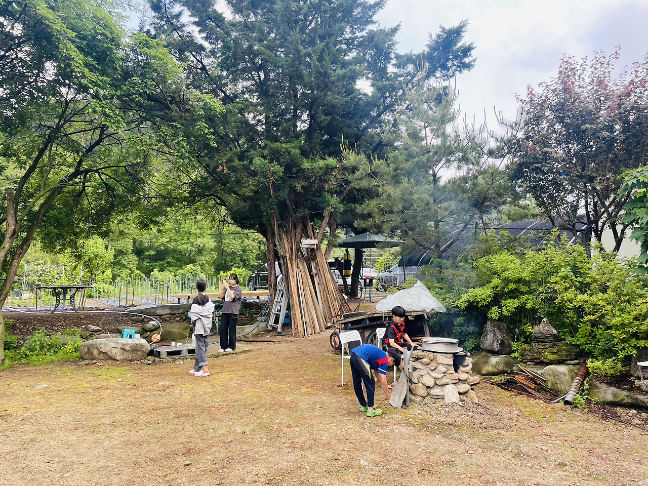 아버님께서 시멘트를 발라 만들어놓으신 호숫가 너른 마당에는 시원한 지하수가 수도세 내놓으라는 압박도 없이 콸콸 흘러나오고 있으니 아이들을 그 물을 받아다가 땅에 연신 뿌리기 바쁘다. 논밭일 할 때 쓰시는 쟁기, 호미는 모래놀이 용품보다 훨씬 정교하게 땅을 파기 좋으니 하루종일 땅을 파고 물을 뿌리며 놀다가 어머님 아버님께서 손수 농사지으신 고추와 방울토마토가 열매를 맺기 전 피워놓은 꽃을 물끄러미 들여다보기도 하고 난생처음 보는 벌레에 손사래를 치며 도망도 다니고 하다보면 하루종일 심심할 틈이 없다. 사방팔방이 놀이터가 되어주니 아이들이 좋아할 수 밖에.
