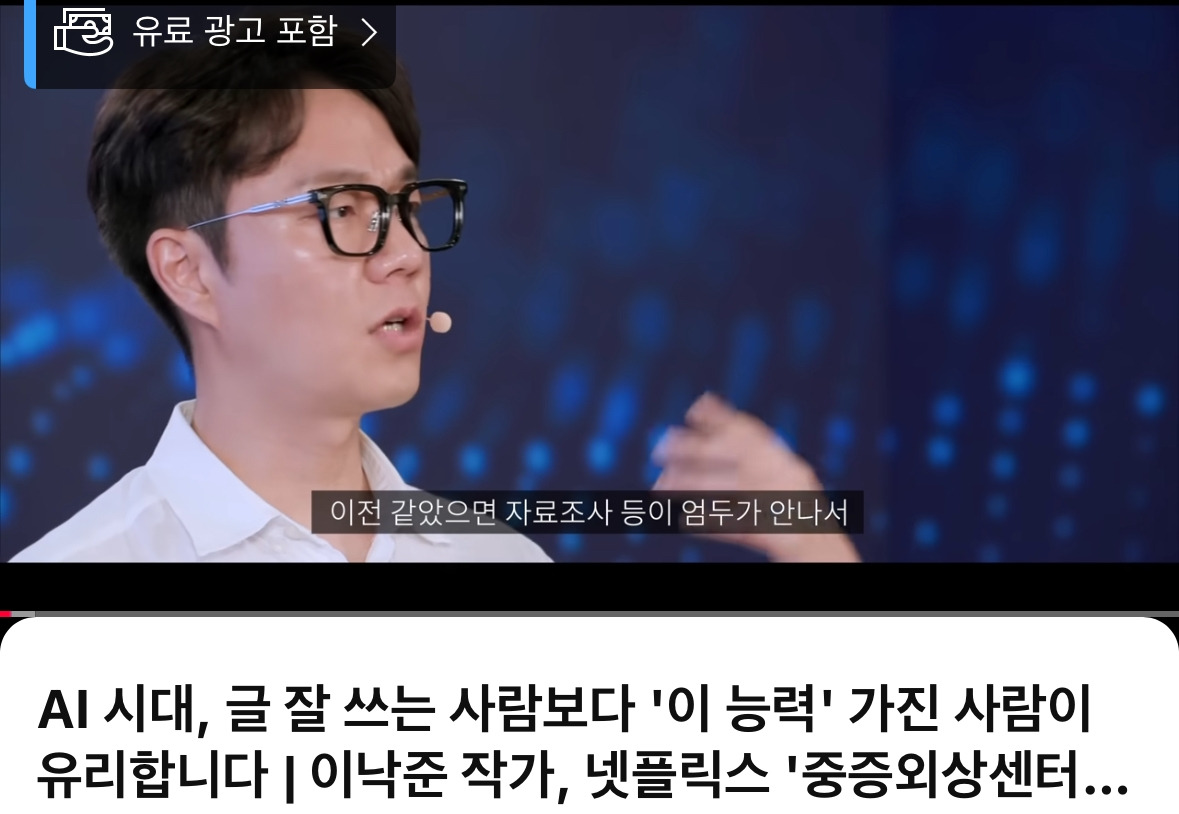 세바시강연]에서 이낙준 작가의 말이 인상깊게 다가왔다. ai시대 글쓰기의 혼란스러운 이 시점을 어떻게 받아들이고 변화시킬 수 있을지 확실한 감을 찾게 되었다.
