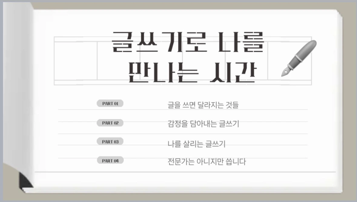한 시간동안 내면치유와 자기강화에 맞춘 글쓰기강연을 준비했다. 글을 쓰기 시작하면 기분좋은 변화들이 몇 가지가 있고 글을 쓰는 유익은 무궁무진하지만 첫 강의는 내면치유에 포인트를 맞춰 준비했다. 글쓰기란 자기 자신을 돌아보고 만나는 시간이기에. 우리는 그런 시간을 두려워하지 않고 당당하게 즐겨야 한다. 생각보다 나는 나 자신을 잘 모른다. 그렇기에 우리는 부지런히 내 마음을 들여다보아야 한다. 그 시간을 통해 작은 상처들이 치유되고 흐릿한 감정들이 선명해지면서 나 답게 살아갈 수 있는 힘이 길러진다.그게 바로 내적강화. 자기성찰의 시간이 되는 것이다.