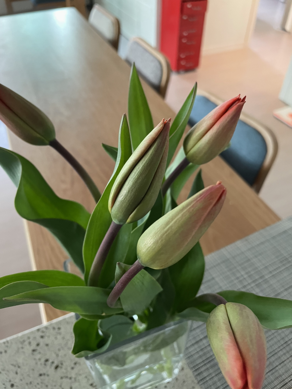 너무 싱싱한 상태로 와서 좀 당황스러웠다. 하지만 가만히 들여다보고 있자니 아직 꽃이 피기 전 푸르른 꽃몽우리가 활짝 핀 꽃과는 다른 매력이 있다. 정확히 이틀만에 꽃봉우리가 벌어지고 예쁜 빛깔과 자태를 드러낸다. 아이들도 신기해하며 연신 나에게 알려준다. 튤립이 활짝 피었다고...