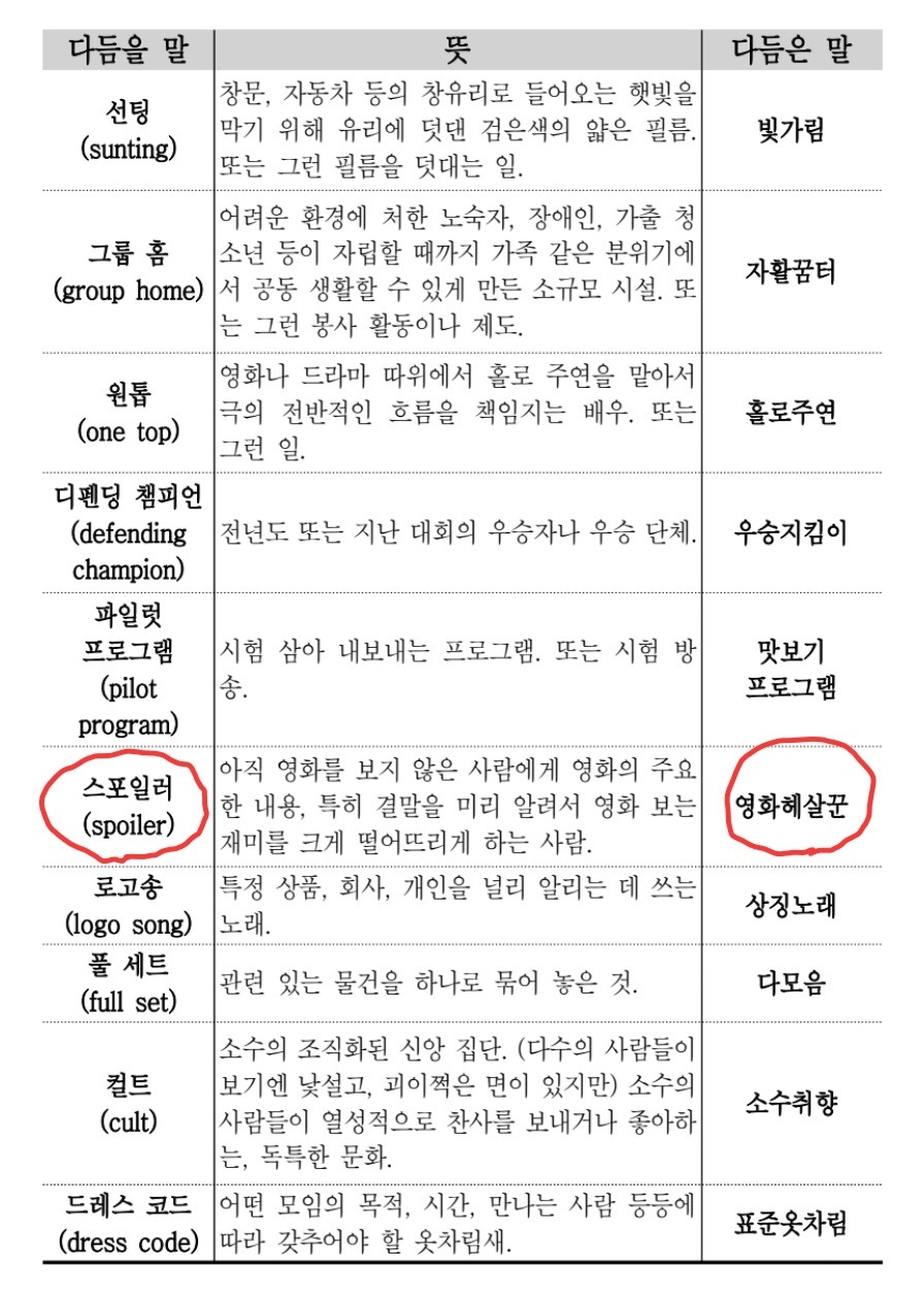 “2005년 11월 국립국어원은 함부로 쓰이는 외래어와 외국어를 걸러 내고, 우리말을 더 다듬어 가꾸기 위하여 일반 국민을 대상으로 ‘우리말 다듬기’ 운동을 펼치고 있다. 이 운동은 2004년 7월 5일부터 ‘모두가 함께하는 우리말 다 듬기(www.malteo.net)’ 사이트를 마련하여 운영하면서 시작된 것이다. 국립국어원이 다듬어 써야 할 외래어와 외국어를 매주 하나씩 선정하여 발표하면 일반 국민이 그 말을 대신할 우리말을 자유롭게 제안하여 결정하도록 하였다. 2005년 9월 초부터 11월 말 현재까지 이 사이트를 통하여 일반 국민이 직접 다듬은 말은 다음과 같다.”