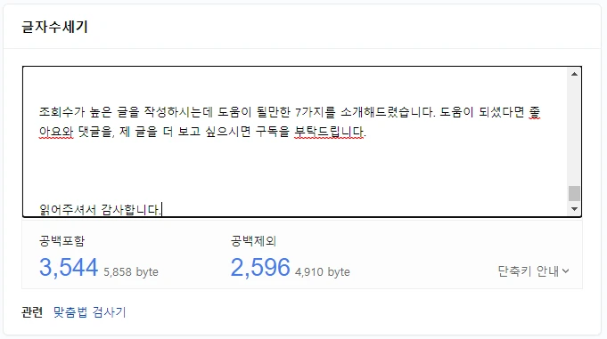 저는 평소 네이버에서 글자 수 세기를 검색해서 이용하고 있습니다. 저도 평균적으로 1000 ~ 2000자에 맞추기 위해서 노력했고, 읽기에도 그 정도가 부담 없고 적절하게 느껴졌었습니다.