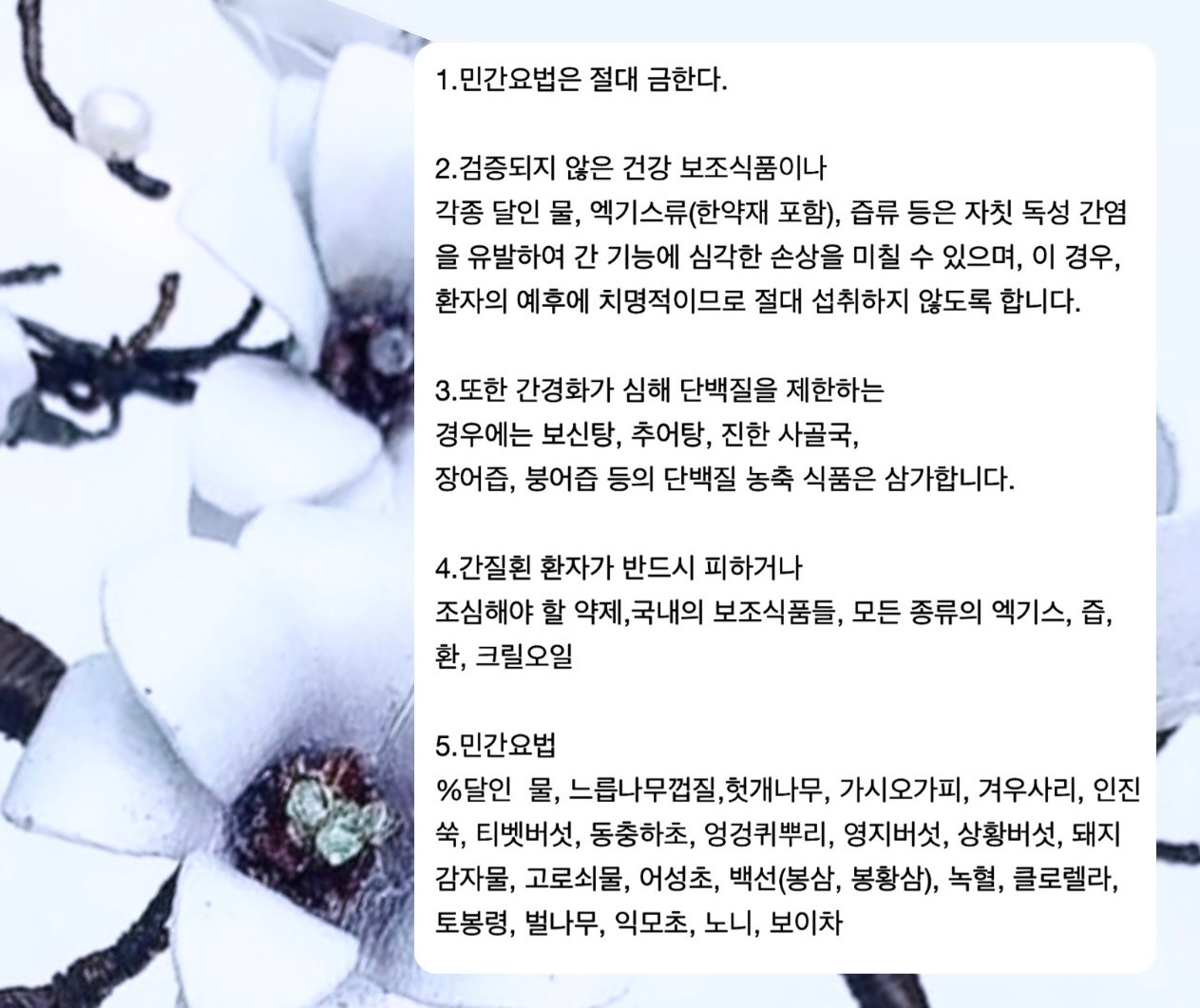 민간요법은 절대 금하며, 검증받지 않은 건강보조식품이나 각종 달인 물, 진액류, 즙류 등은 자칫 독성 간염을 유발해 간기능에 심각한 손상을 일으킬 수 있으며, 이 경우 환자의 예후에 치명적이므로 절대 섭취하지 않도록 한다.