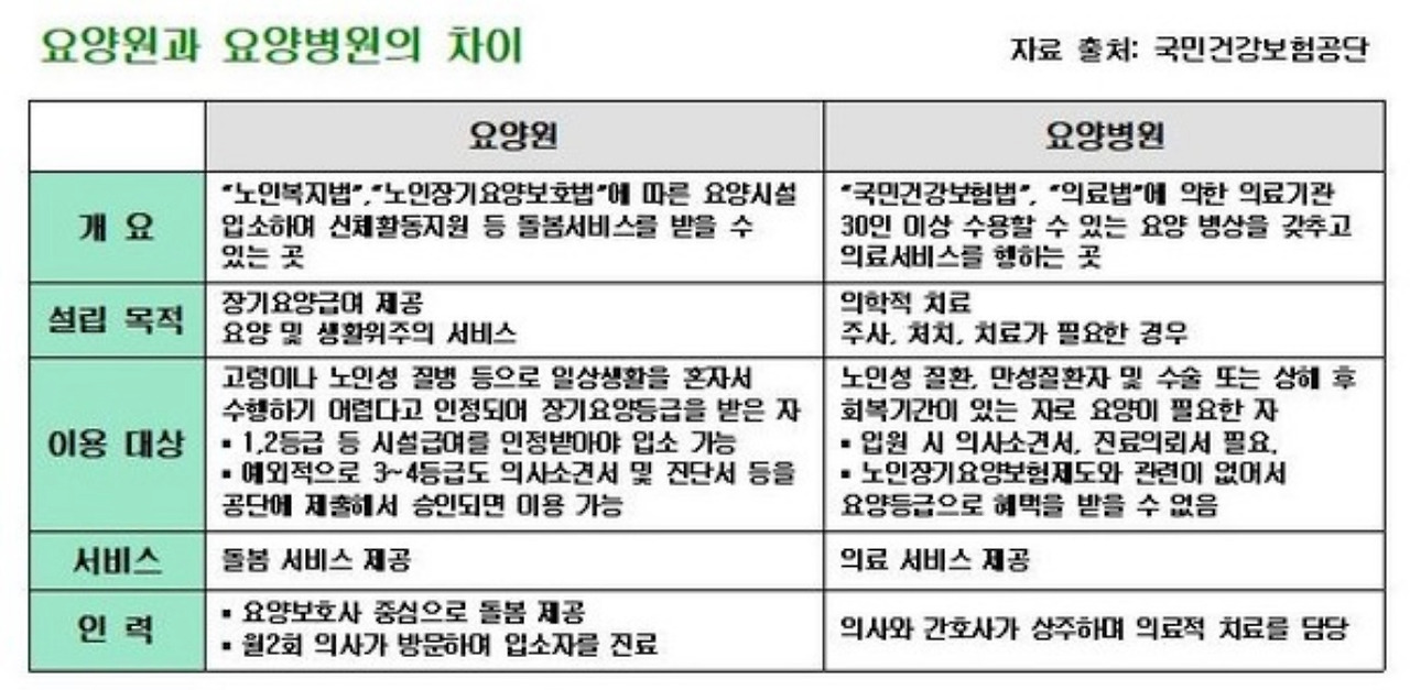 요양원과 요양병원은 차이점이 있다. 의사의 치료가 필요할 경우 요양병원을 이용하는데, 건강보험으로 적용을 받는다.