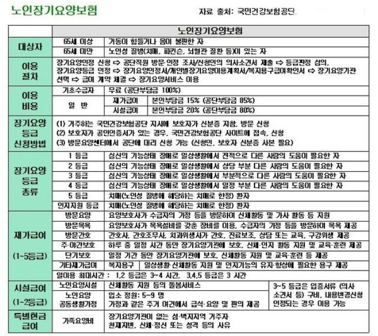 엄마를 간병하면서 6개월 후에야 노인장기요양보험을 알게 되어 신청했다. 좀 더 빨리 알았더라면 엄마를 좀 더 편히 모실 수 있었다. 거동이 힘들거나 몸이 불편한 65세 이상 어르신과 65세 미만이라도 치매, 파킨슨, 뇌혈관질환 등 노인성 질환이 있다면 빨리 요양등급을 신청해 놓는 것이 좋다. 갑자기 필요하게 될 수가 있다.