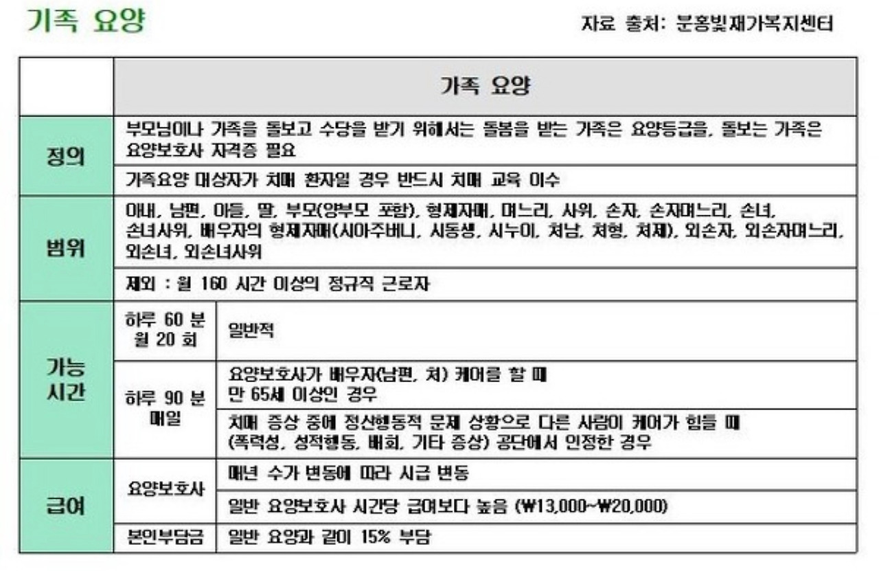 가족요양은 요양받는 가족은 본인 부담금 15%를 센터에 내고, 요양보호사는 급여를 센터에서 받는다. 가족 중 아들, 딸, 형제, 자매, 며느리, 사위, 손자, 손녀 등 폭넓은 가족의 범위이며, 월 160시간 이상의 정규직 근로자는 제외된다.