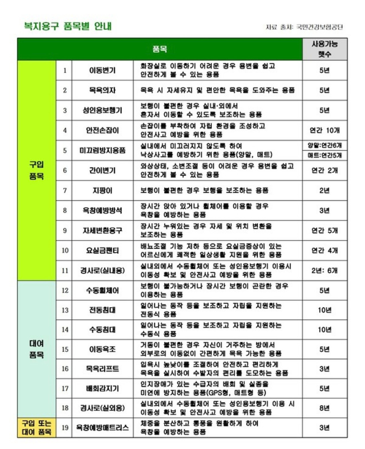 전동침대 외에도 필체어 등 대여나 구매할 수 있는 복지용구가 많으며, 기저귀도 무상으로 받을 수 있는 곳들이 많았다. 돈을 크게 절약할 수 있다.