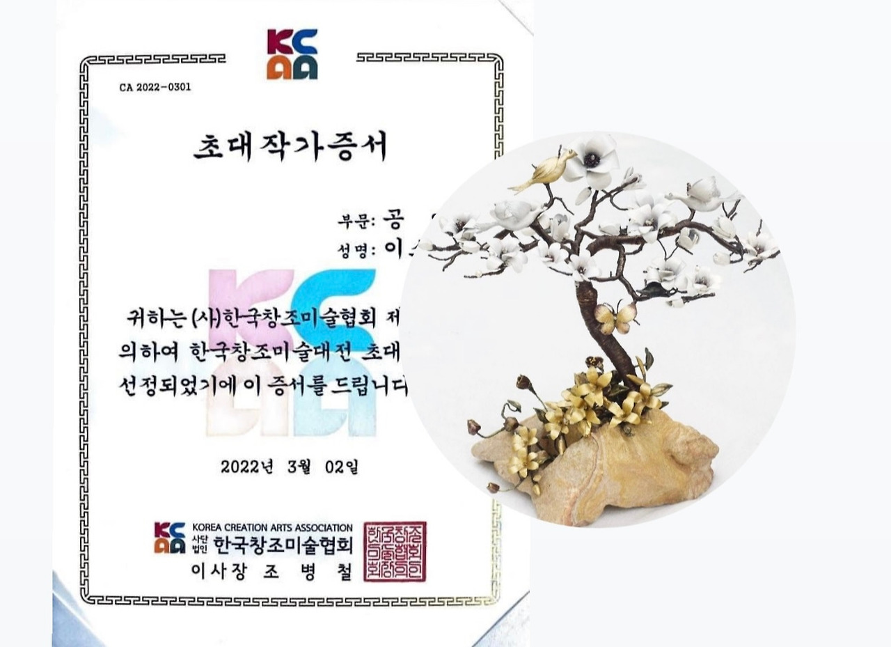 내가 그렇게도 원하던 공예의 2일 발급한 초대작가증서를 우편으로 받았다. 우리 엄마는 공예가가 되기 위해 피나는 노력을 하는 나를 항상 지켜보셨었다. 엄마가 선물해 주신 초대작가가 되어 작년 여름 초대작가 특별전에 ‘장밋빛 인생’이라는 작품으로 벅찬 가슴을 누르며 참가했다.