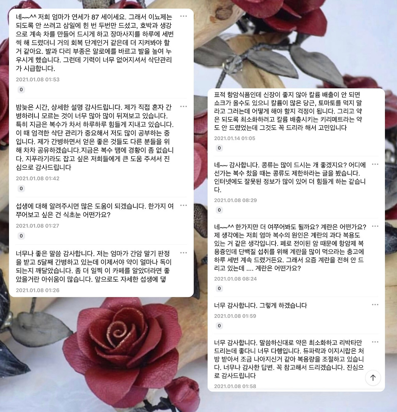 본인이 직접 체험한 정보 이상 신뢰할 수 있는 정보는 없다. 지푸라기라도 잡고 싶은 환자나 가족을 위해 간암을 이겨낸 환우들이 새벽에도 귀한 시간 내어 질문을 받아주며 상담해 주었다.