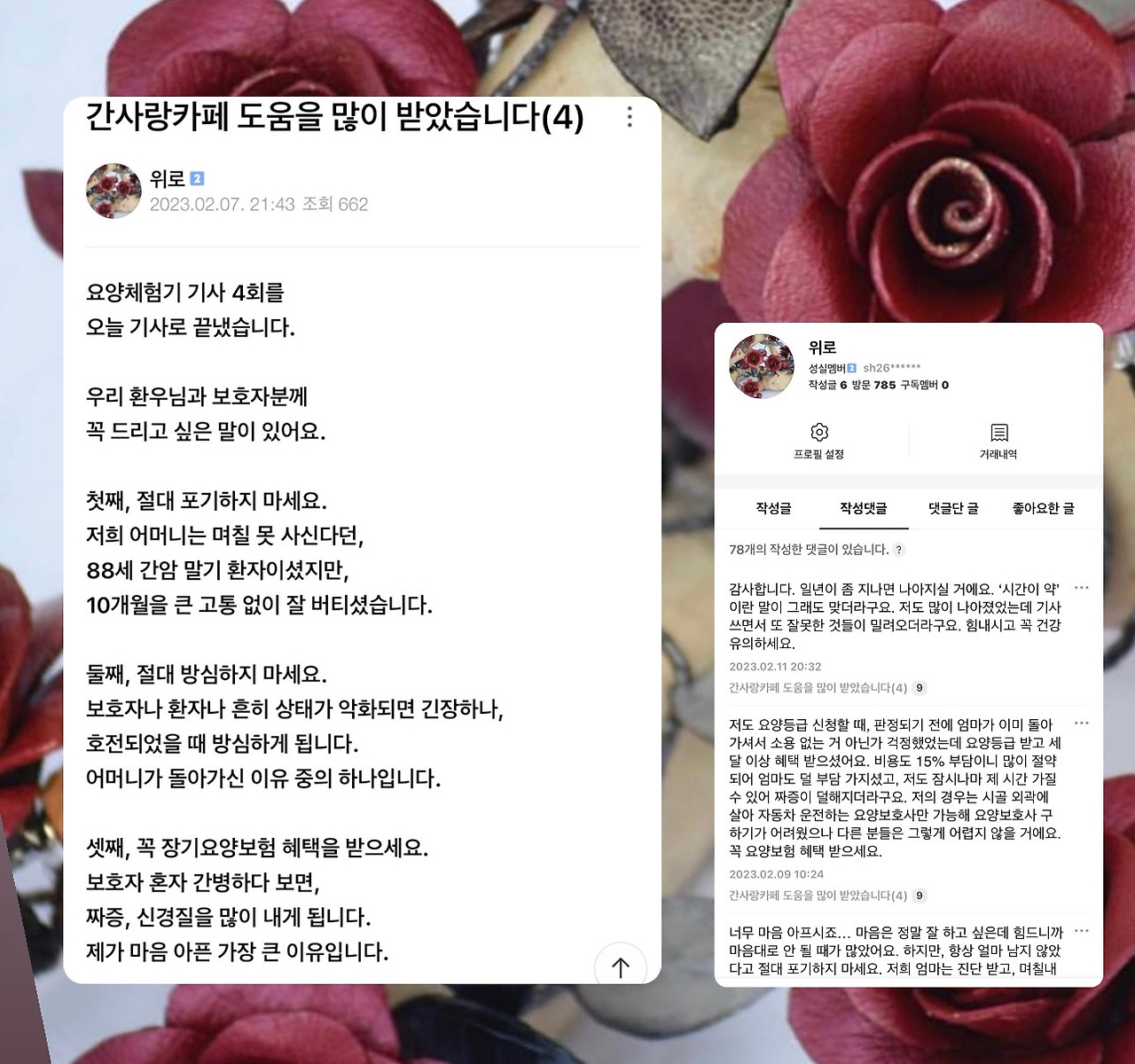 엄마가 하늘나라에 가신 다음 나는 다시 카페에 찾아가서 ‘간사랑카페 도움을 많이 받았습니다’라는 제목으로 4번 게시물을 올렸다. 나도 작은 도움이 되고 싶어 장기요양보험에 관한 정보를 올렸다. 사실 모든 사람들에게 하고싶은 말이다.