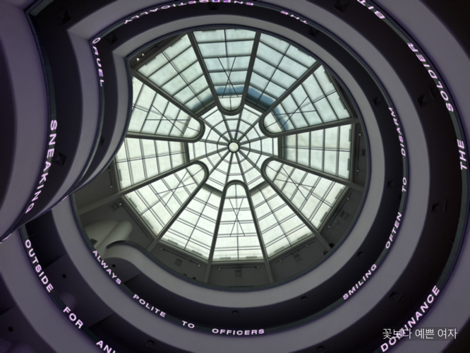구겐하임 미술관의 공동 설립자이자 첫 번째 관장이었던 힐라 레베이(Hilla Rebay)는 미술관을 라이트에게 의뢰하면서 ‘정신의 성전(temple of spirit)’을 원한다고 말했는데, 돔을 올려다보면 마치 대성당의 장미 창을 추상적으로 표현한 듯하다.