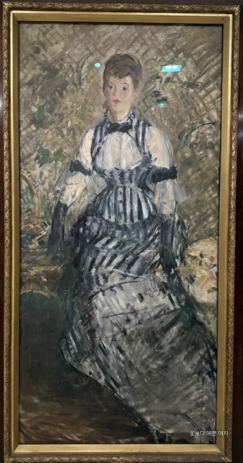 현대적인 스타일의 옷을 입은 매력적인 이 그림 속 모델은 실제로 르누아르의 동반자로, 다양한 복장을 하고 여러 차례 그에게 포즈를 취한 여인이다. 르누아르는 이후 밝은 색조의 인상파 스타일로 유명해졌지만, 이 초기 작품에서는 어두운 팔레트와 절제된 붓놀림이 보인다.